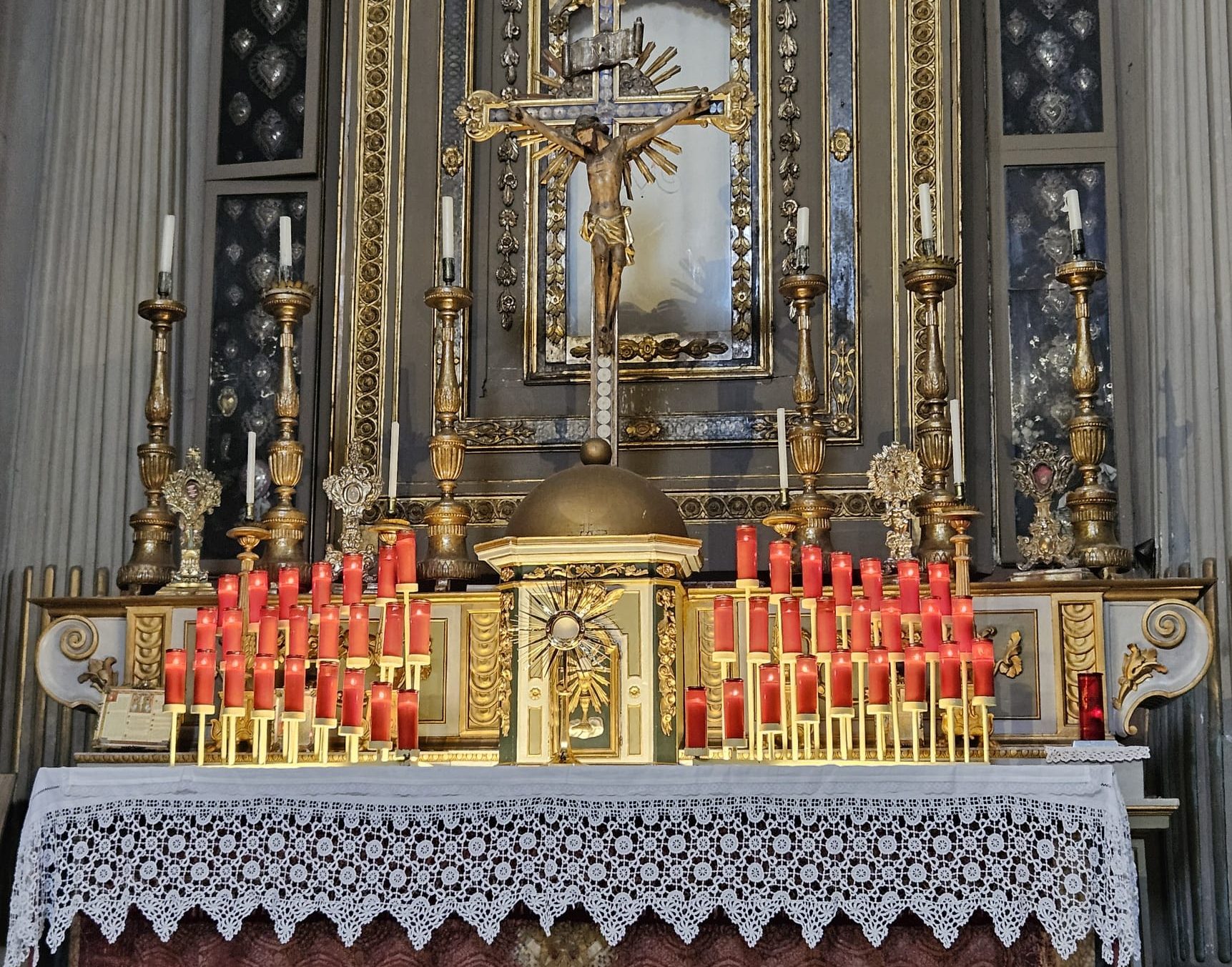 Dopo il Concilio di Trento, per rafforzare la fede nell’Incarnazione di Gesù Cristo, le devozioni delle “Quarant’ore” erano promosse anche con l’aiuto di apparati tecnici, vere scenografie che puntavano ad esaltare la centralità dell’Ostensorio con il suo Sacro contenuto, costituite da lumi, candele, lumini, nastri e mensole dorate.