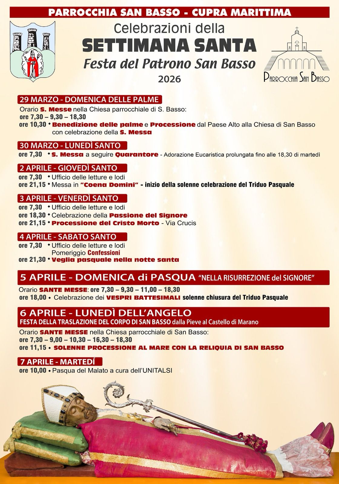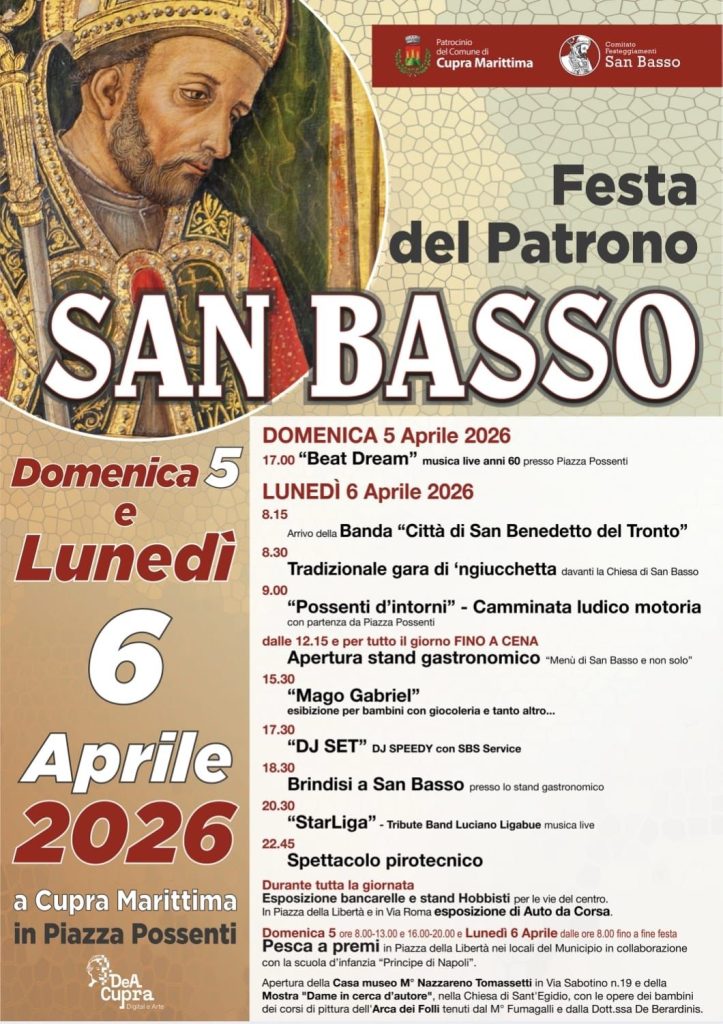 CUPRA MARITTIMA – “Il 6 aprile il Vescovo Gianpiero Palmieri, delle Diocesi di Ascoli Piceno e San Benedetto del Tronto-Ripatransone-Montalto, presiederà la Messa delle 10.30; a seguire, alle 11.15, si svolgerà la processione, anch’essa presieduta dal Vescovo. Questa è la più sentita delle tre feste dedicate a San Basso: ricorda la traslazione del suo corpo dalla Civita al Borgo di Marano, nella chiesa di Santa Maria in Castello.