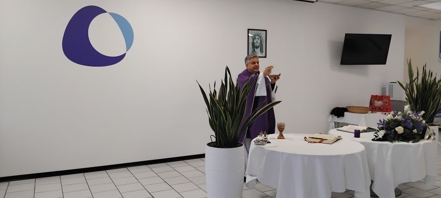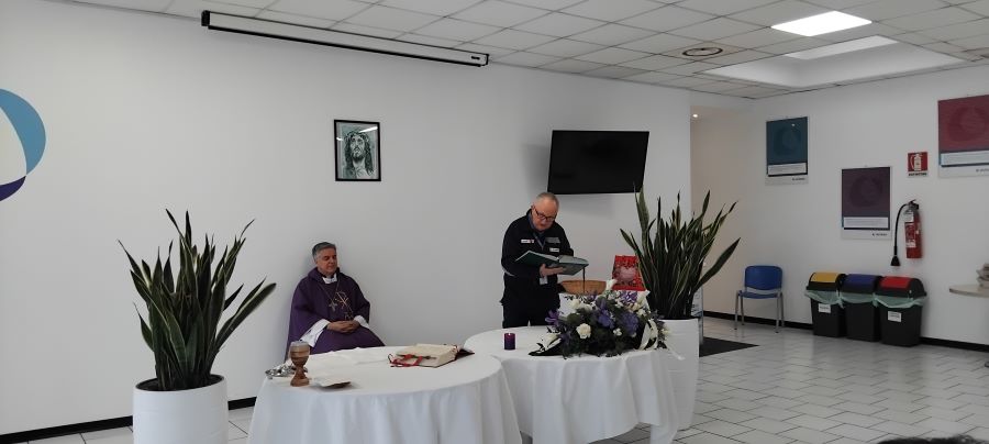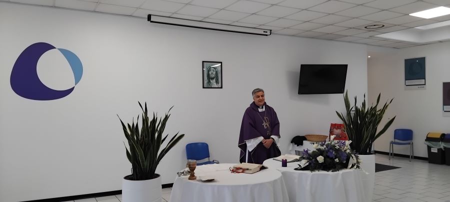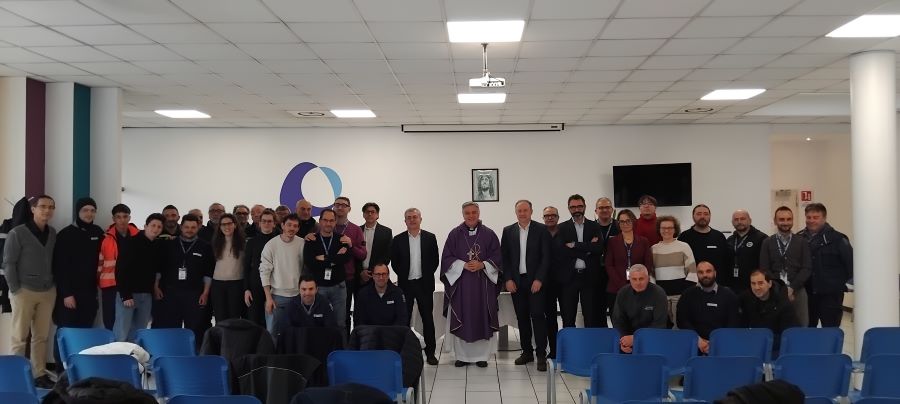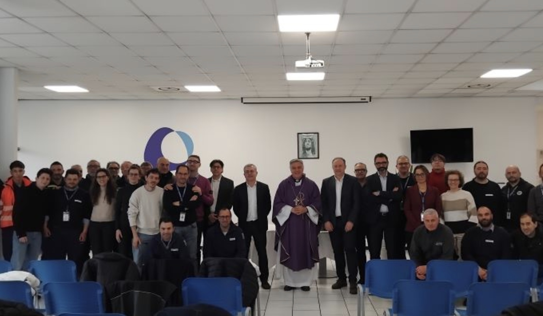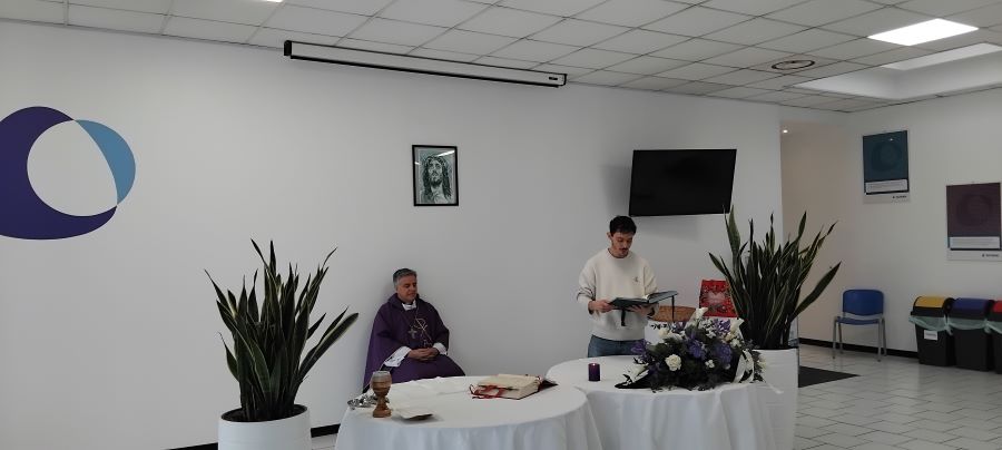 La Santa Messa, officiata all’interno della mensa aziendale, ha rappresentato non solo un momento per lo scambio degli auguri di una serena Pasqua, ma anche un’importante occasione di condivisione e riflessione sui valori della fede, della speranza e della pace. La scelta del luogo ha voluto sottolineare come la dimensione spirituale non sia separata dalla quotidianità, né dalla fatica del lavoro e dagli impegni di ogni giorno.