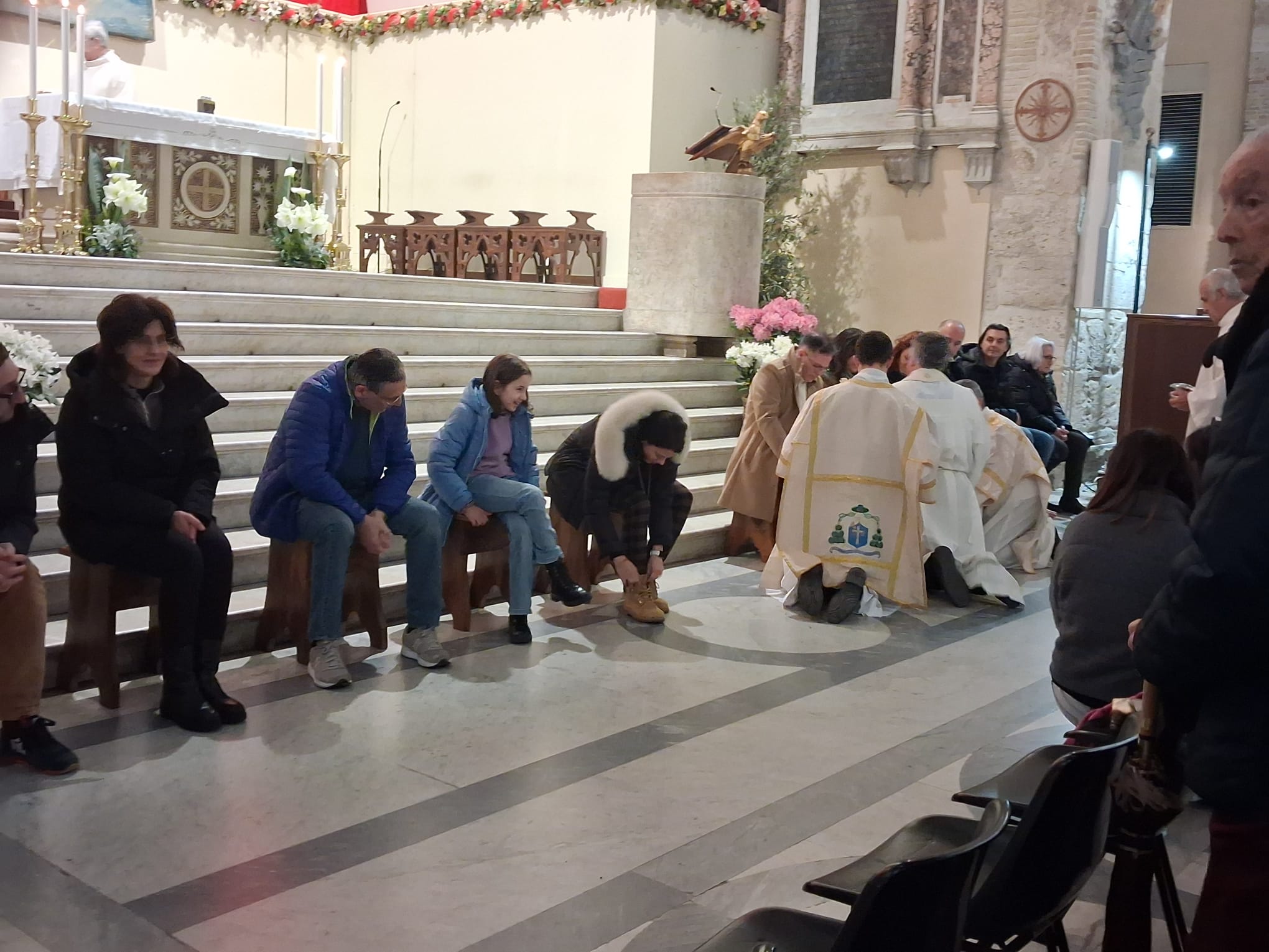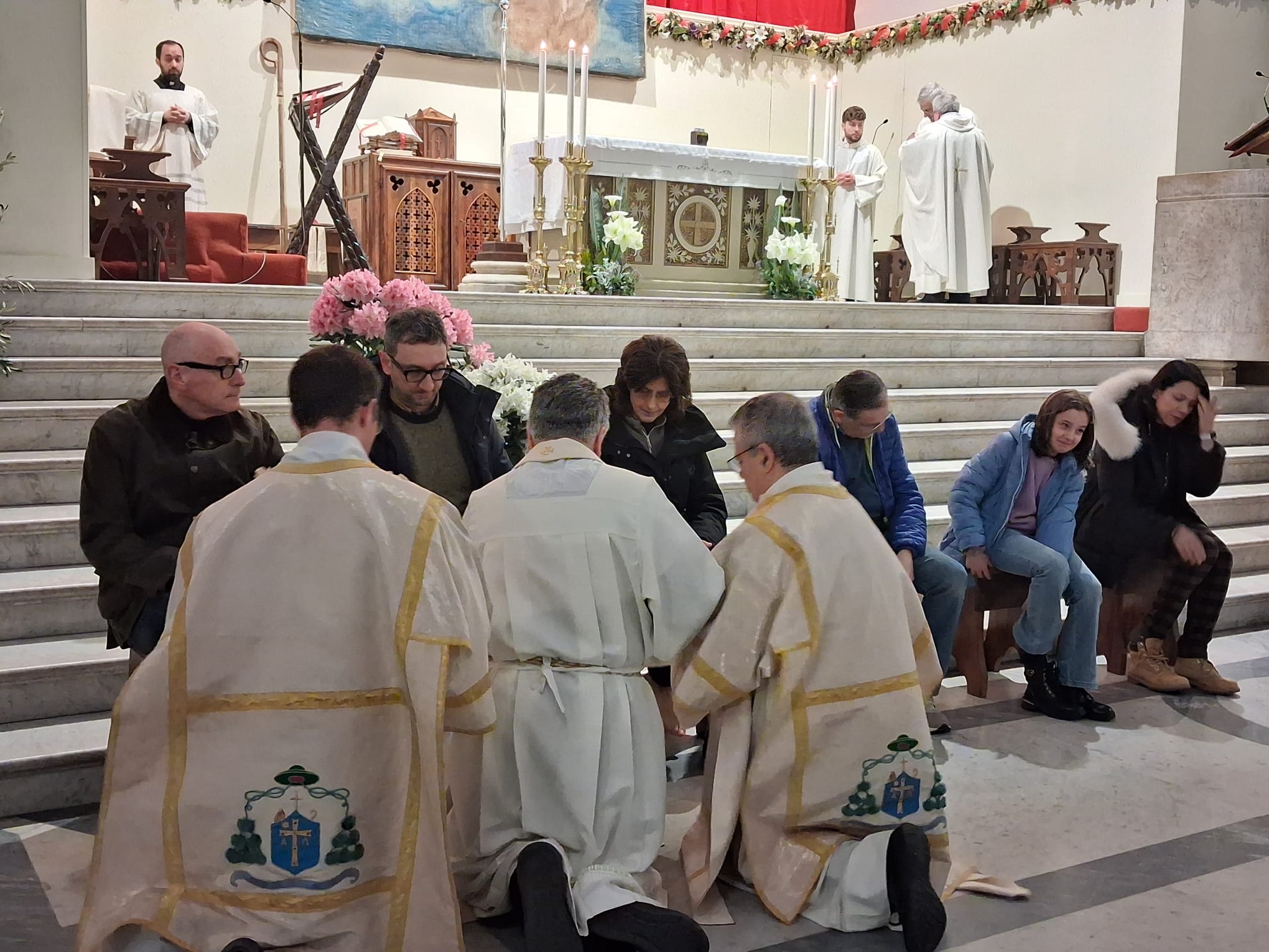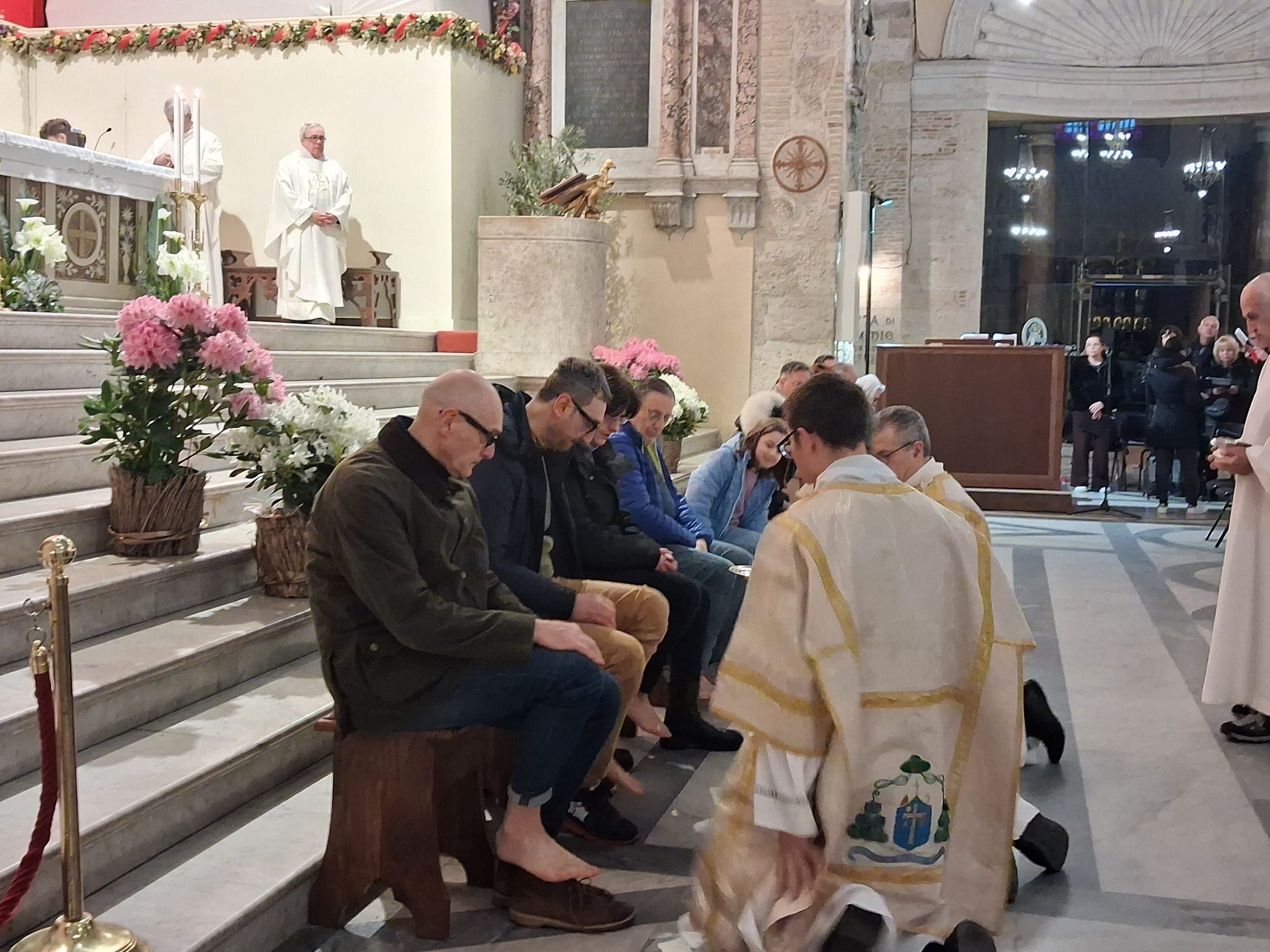Conclusa l’omelia, il vescovo Palmieri, come fece Gesù, si spoglia delle proprie vesti indossando un grembiule servile e si abbassa, in ginocchio, a lavare i piedi ai fedeli lì presenti.