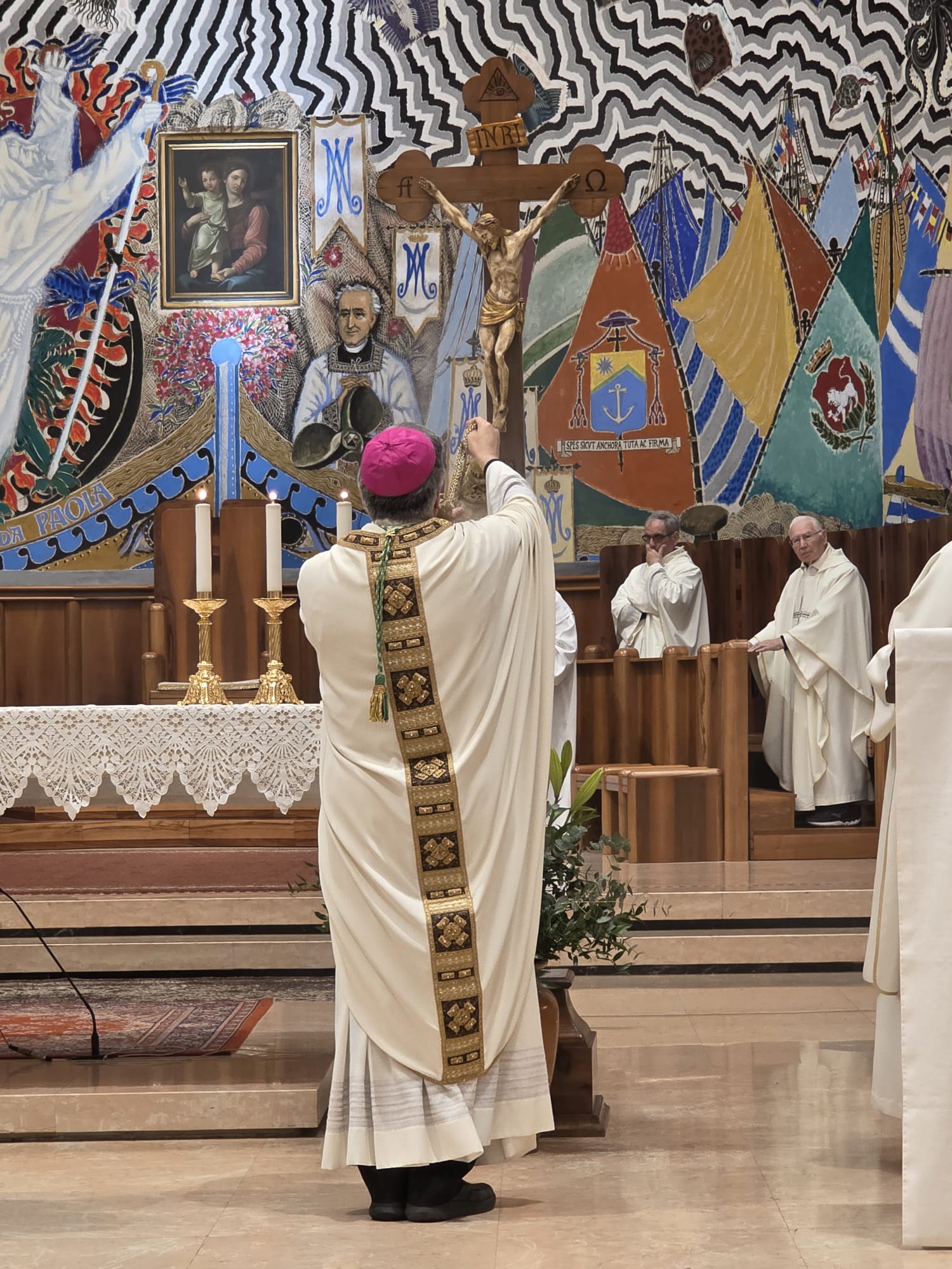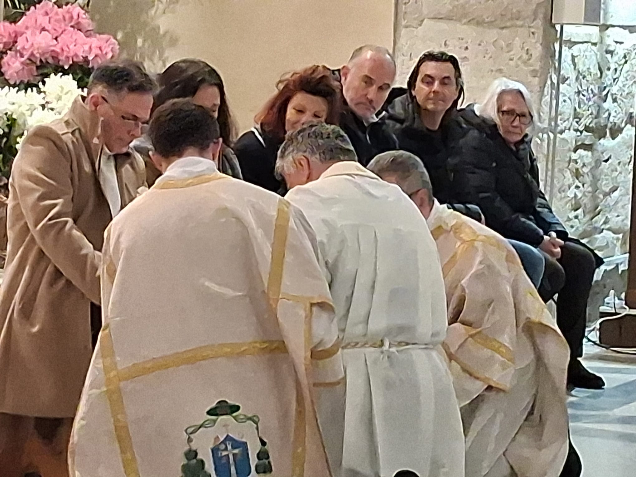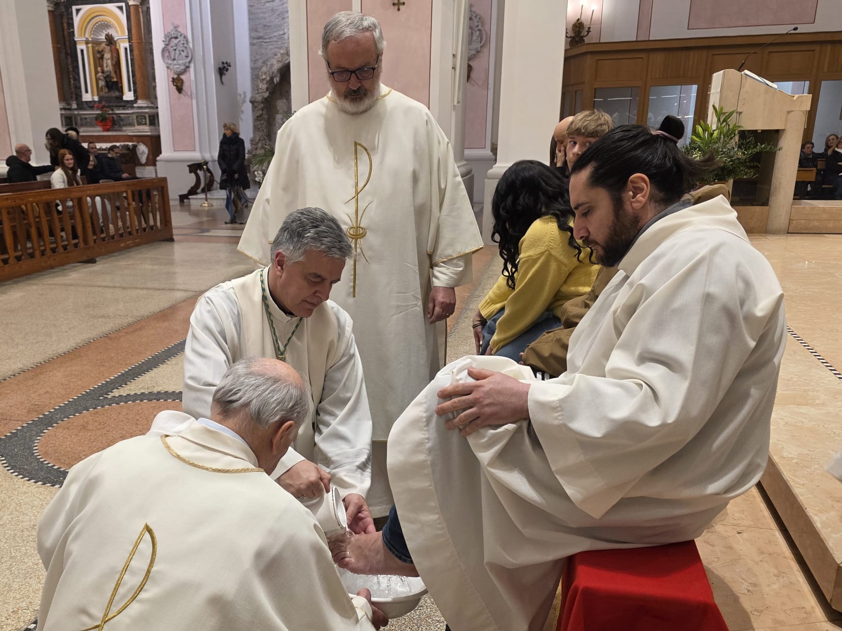 Conclusa l’omelia, il vescovo Palmieri, come fece Gesù, si spoglia delle proprie vesti indossando un grembiule servile e si abbassa, in ginocchio, a lavare i piedi ai fedeli lì presenti.