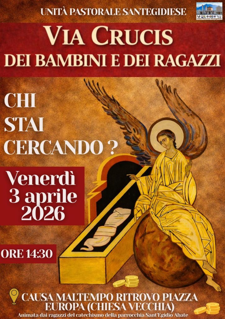 SANT’EGIDIO ALLA VIBRATA – Si svolgerà oggi, 3 Aprile 2026, tra poche ore, precisamente alle 14:30, la Via Crucis dei bambini e dei ragazzi del catechismo dell’Unità Pastorale di Sant’Egidio alla Vibrata. A causa del maltempo, il ritrovo sarà presso piazza Europa.