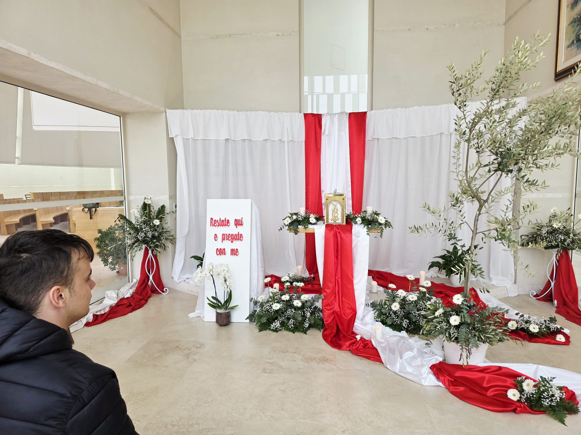 CASTEL DI LAMA – Mancano poche ore alla notte di Pasqua e nella suggestiva chiesa del Santissimo Crocifisso in Castel di Lama il silenzio è assoluto. Faccio il segno della croce e sono in procinto di proseguire oltre il meraviglioso fonte battesimale sito all’ingresso, quando vengo distratta dal fascio di luce che proviene dalla mia destra: dall’altare della riposizione, circondato da piante di ulivo e delicati fiori bianchi, avvolto in lunghi drappeggi di stoffa rossa, si irradia una luce abbagliante che, insieme all’oro del Santissimo e alla parete di vetro trasparente, crea un gioco di riflessi assolutamente sbalorditivo.