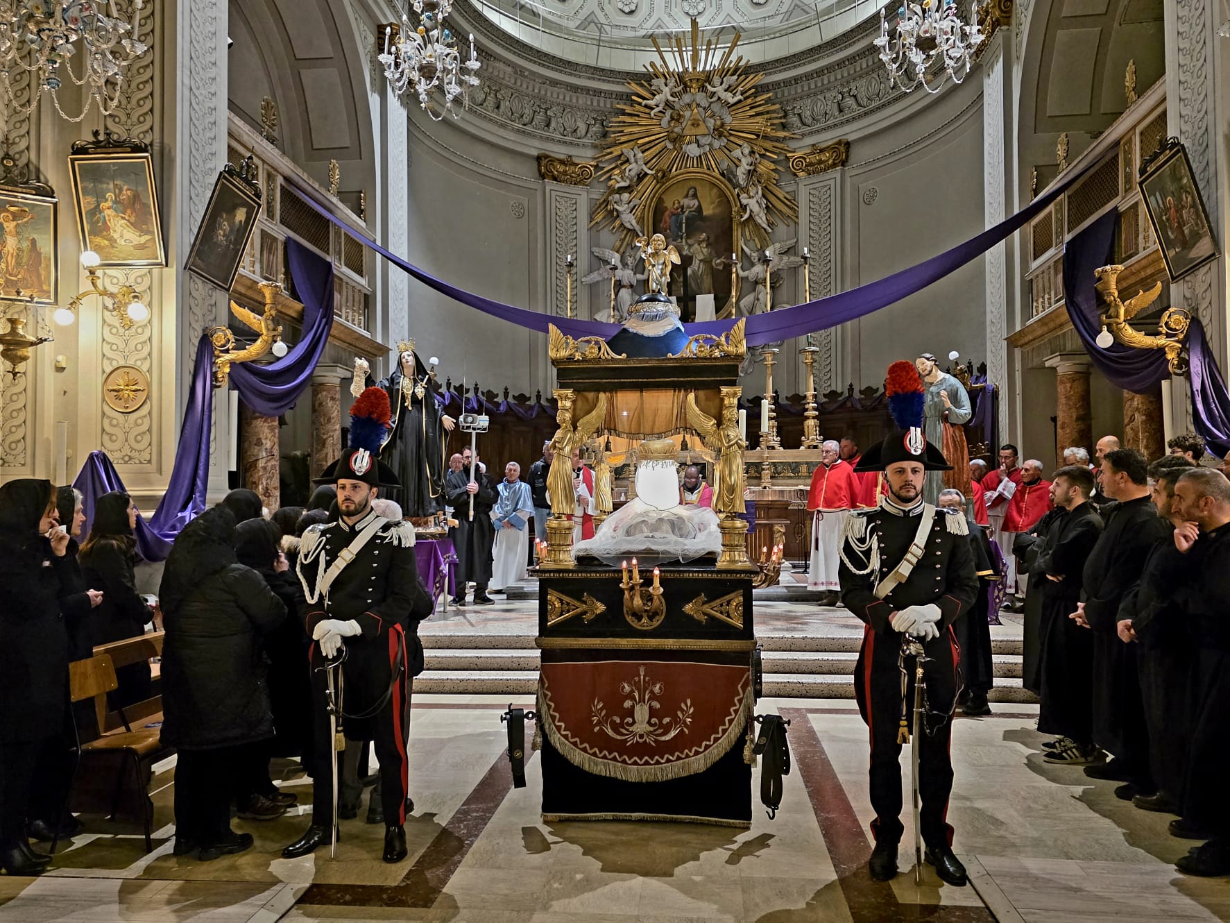 La solenne processione, organizzata dalla Confraternita della Pietà e delle Morte, ha registrato la partecipazione di centinaia di figuranti che hanno accompagnano la bara del Cristo Morto, sostenuta a spalla da 56 portatori che, a squadre da 4, si sono alternati lungo il faticoso percorso.