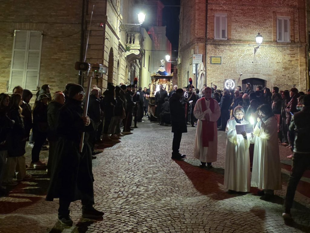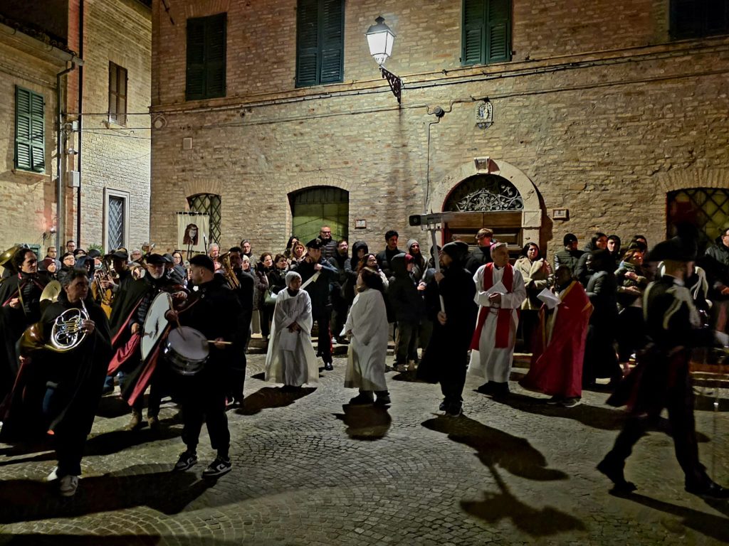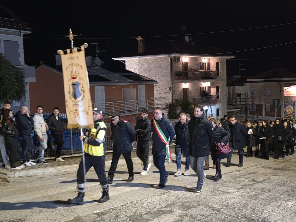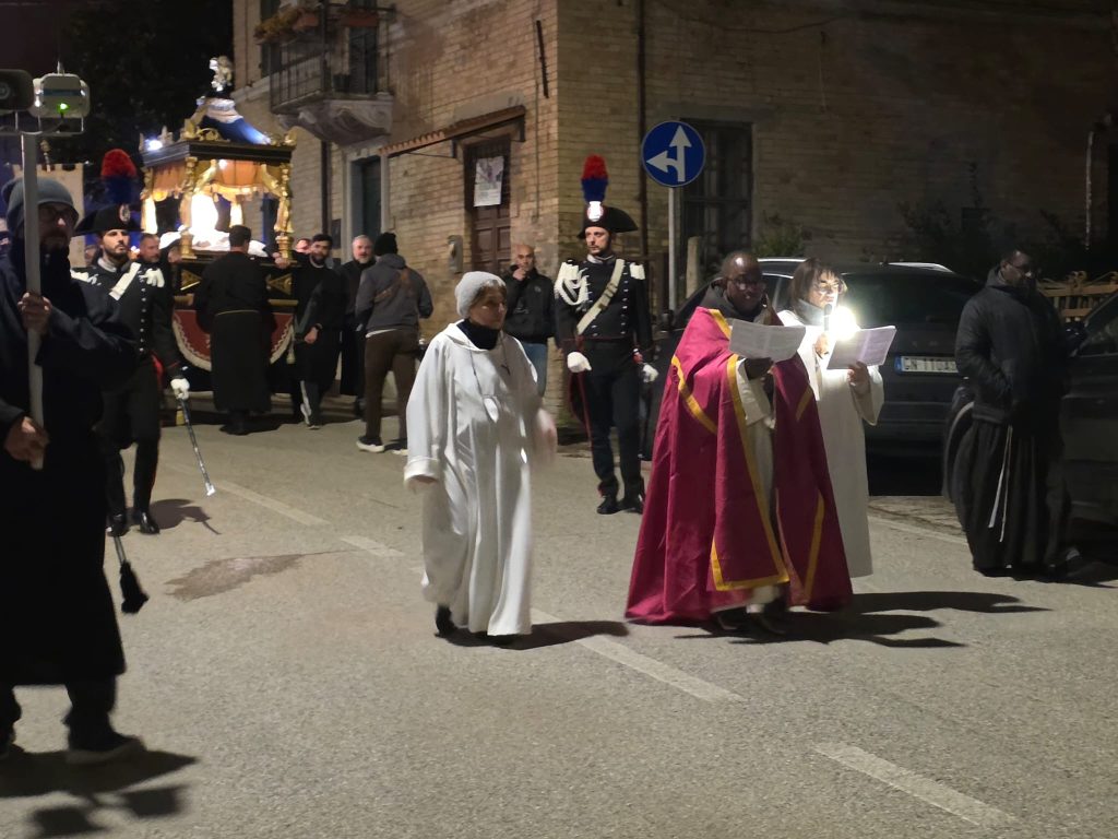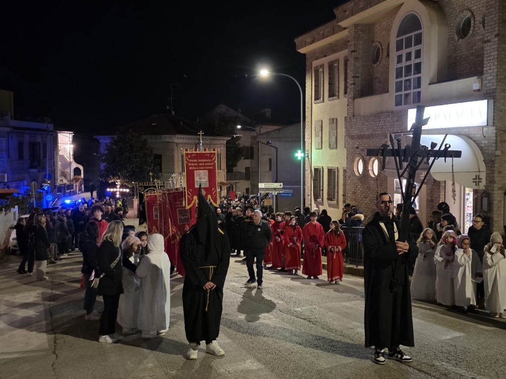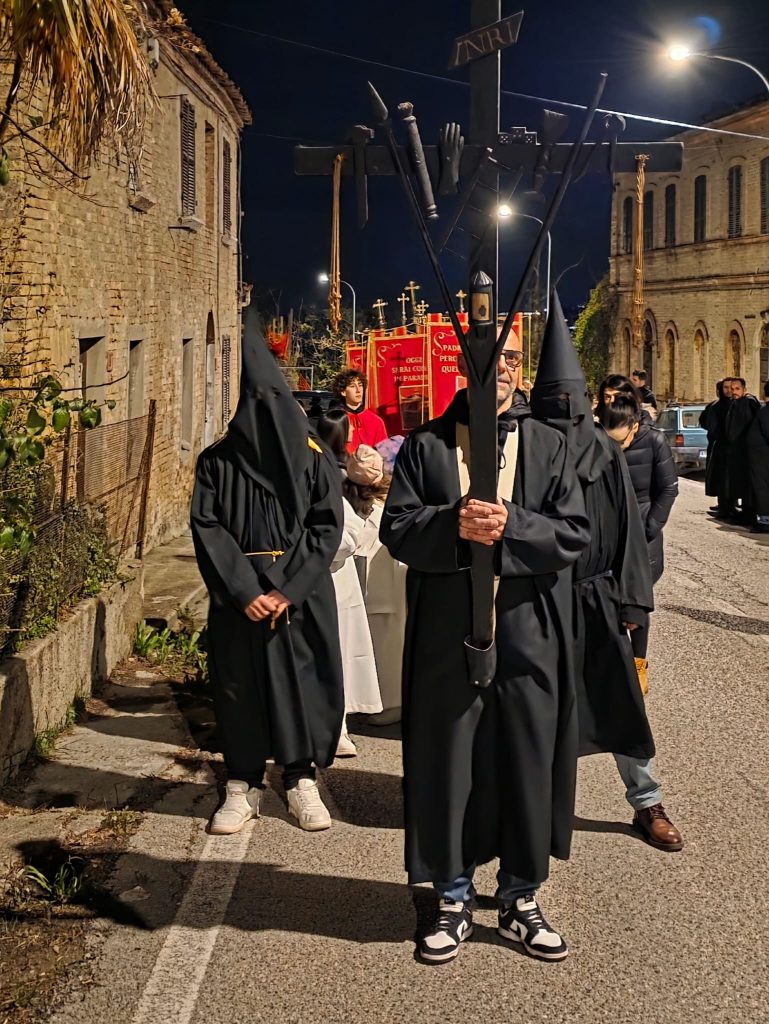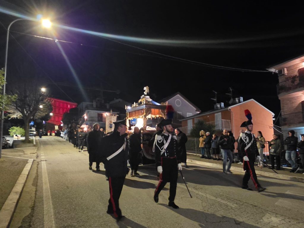“Ieri sera, come da tradizione, invece, abbiamo potuto onorare la Morte di Gesù con una grande partecipazione di fedeli. Nel corteo, hanno sfilato, nell’ordine: la croce e gli incappucciati; le bambine vestite di bianco; poi i giovani con gli stendardi contenenti le sette parole pronunciate da Gesù sulla croce; i confratelli della Confraternita della Pietà e della Morte; i musicisti della Banda di Monteprandone che suonano solo in occasione di questa processione per onorare il nostro Signore; i piccoli chierichetti con i simboli della Passione; i presbiteri E la bara del Cristo Morto con al seguito le Pie Donne; la statua della Madonna Addolorata con indosso i preziosi gioielli d’oro che le sono stati donati per le grazie ricevute in questi anni, trasportata dai confratelli di altre due Confraternite del paese, Sant’Anna e Sacro Cuore; le ragazze delle sette spade; la statua di San Giovanni, trasportata dai confratelli della Confraternita del Santissimo Sacramento; un gruppo di francescani del convento di San Giacomo della Marca e, a seguire il numeroso popolo di Dio che ha voluto condividere con noi questo momento di grande spiritualità, a partire dal sindaco di Monteprandone Sergio Loggi, dal comandante della Polizia Locale Eugenio Vendrame e dal comandante della locale Stazione dei Carabinieri Gabriele Luciani, che ringraziamo particolarmente per il dono che ci fa ogni anno concedendoci due Carabinieri in alta uniforme che rendono ancora più solenne la nostra processione”.
