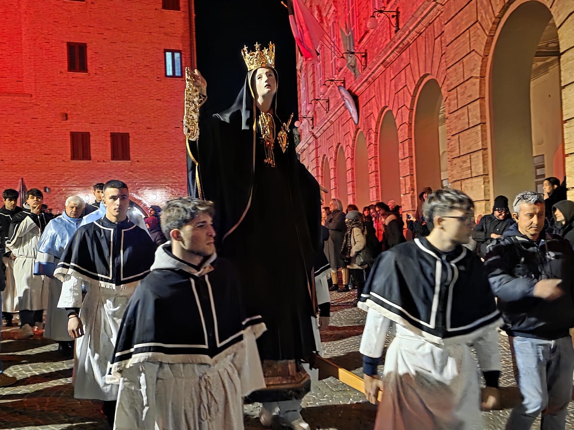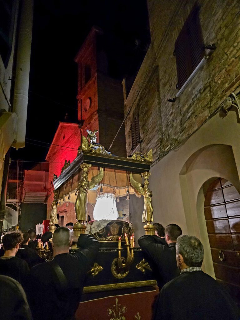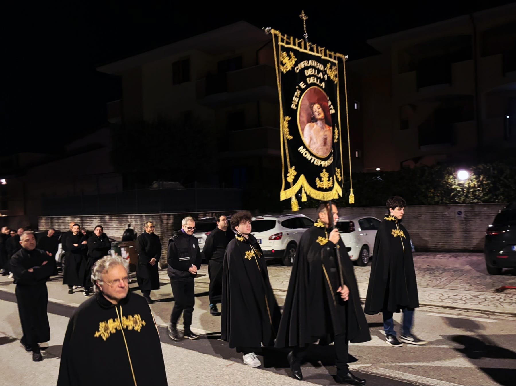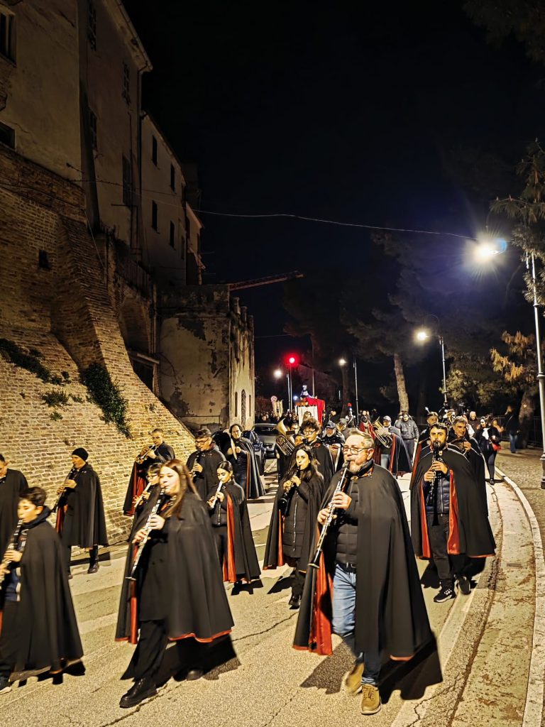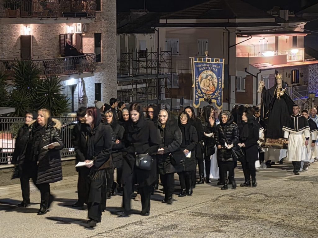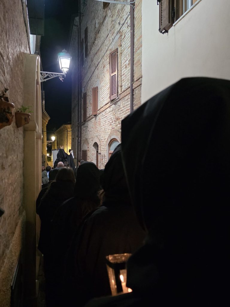 “Ieri sera, come da tradizione, invece, abbiamo potuto onorare la Morte di Gesù con una grande partecipazione di fedeli. Nel corteo, hanno sfilato, nell’ordine: la croce e gli incappucciati; le bambine vestite di bianco; poi i giovani con gli stendardi contenenti le sette parole pronunciate da Gesù sulla croce; i confratelli della Confraternita della Pietà e della Morte; i musicisti della Banda di Monteprandone che suonano solo in occasione di questa processione per onorare il nostro Signore; i piccoli chierichetti con i simboli della Passione; i presbiteri E la bara del Cristo Morto con al seguito le Pie Donne; la statua della Madonna Addolorata con indosso i preziosi gioielli d’oro che le sono stati donati per le grazie ricevute in questi anni, trasportata dai confratelli di altre due Confraternite del paese, Sant’Anna e Sacro Cuore; le ragazze delle sette spade; la statua di San Giovanni, trasportata dai confratelli della Confraternita del Santissimo Sacramento; un gruppo di francescani del convento di San Giacomo della Marca e, a seguire il numeroso popolo di Dio che ha voluto condividere con noi questo momento di grande spiritualità, a partire dal sindaco di Monteprandone Sergio Loggi, dal comandante della Polizia Locale Eugenio Vendrame e dal comandante della locale Stazione dei Carabinieri Gabriele Luciani, che ringraziamo particolarmente per il dono che ci fa ogni anno concedendoci due Carabinieri in alta uniforme che rendono ancora più solenne la nostra processione”.