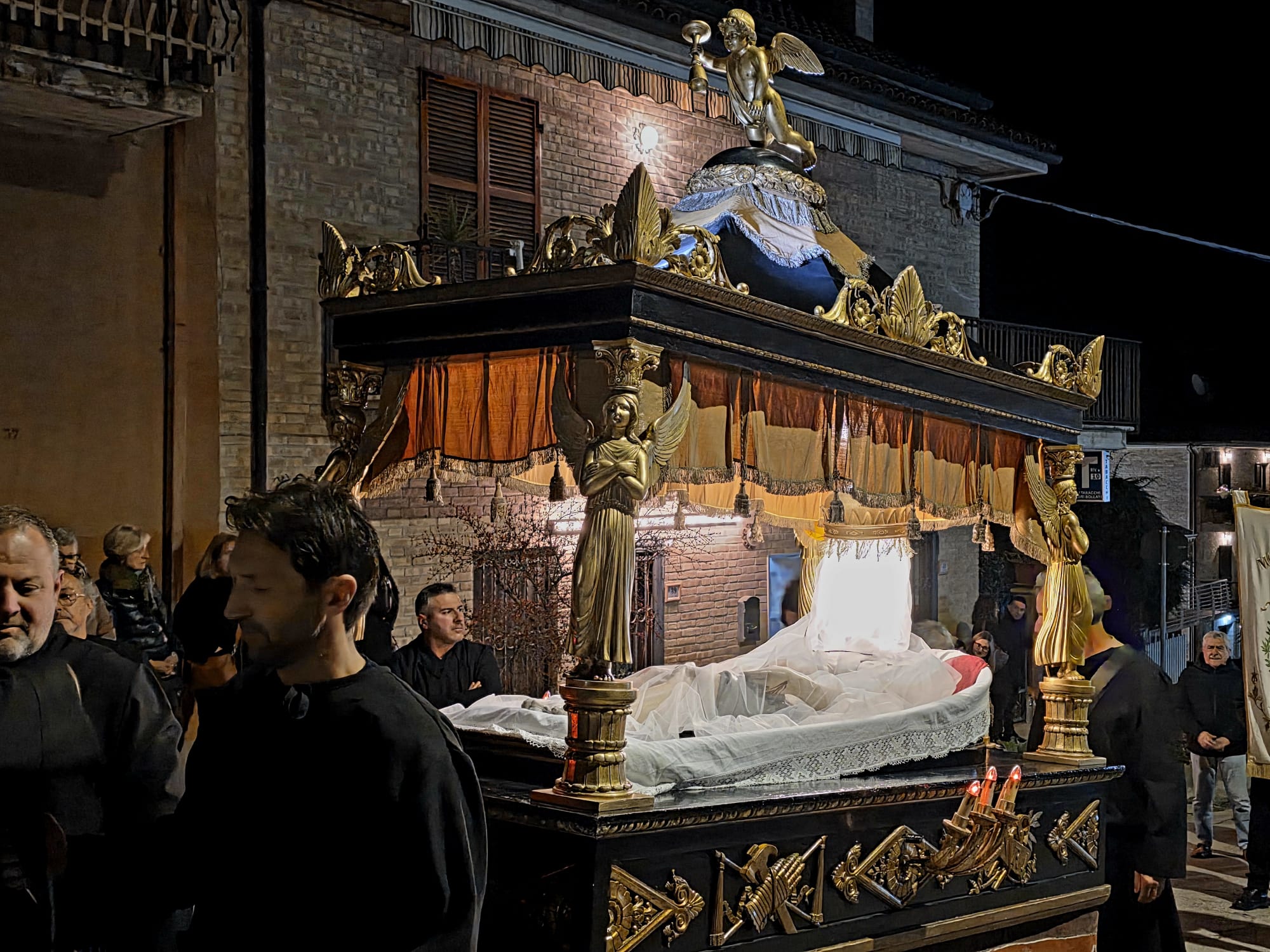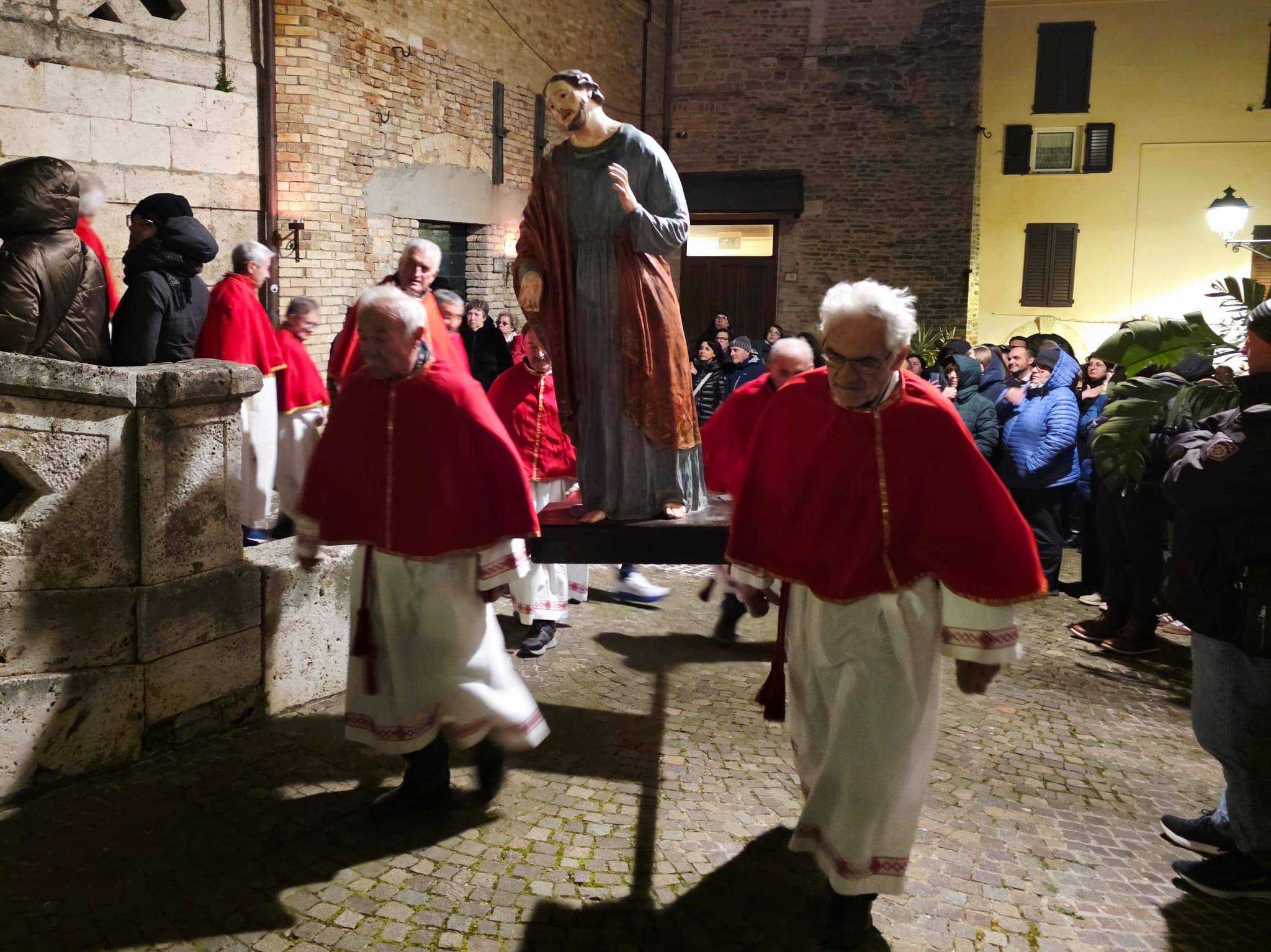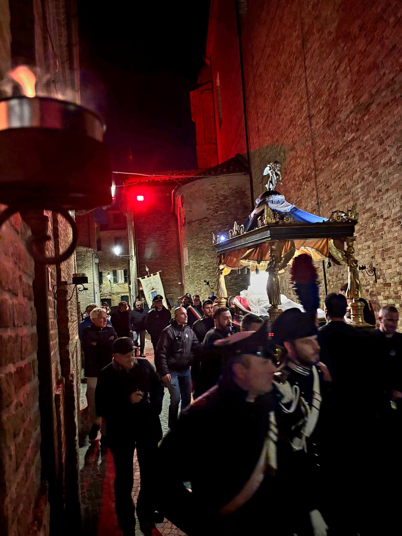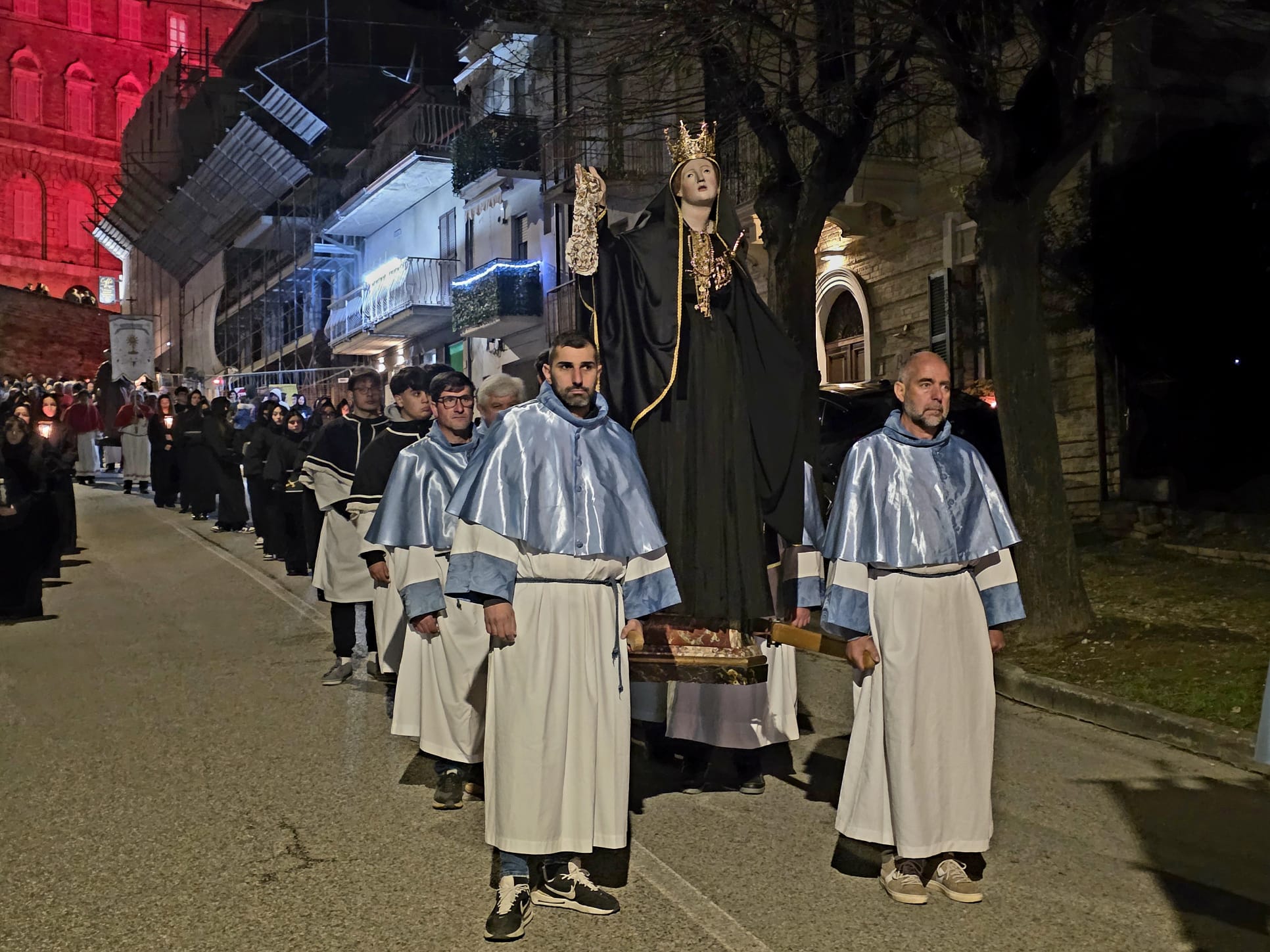“Ieri sera, come da tradizione, invece, abbiamo potuto onorare la Morte di Gesù con una grande partecipazione di fedeli. Nel corteo, hanno sfilato, nell’ordine: la croce e gli incappucciati; le bambine vestite di bianco; poi i giovani con gli stendardi contenenti le sette parole pronunciate da Gesù sulla croce; i confratelli della Confraternita della Pietà e della Morte; i musicisti della Banda di Monteprandone che suonano solo in occasione di questa processione per onorare il nostro Signore; i piccoli chierichetti con i simboli della Passione; i presbiteri E la bara del Cristo Morto con al seguito le Pie Donne; la statua della Madonna Addolorata con indosso i preziosi gioielli d’oro che le sono stati donati per le grazie ricevute in questi anni, trasportata dai confratelli di altre due Confraternite del paese, Sant’Anna e Sacro Cuore; le ragazze delle sette spade; la statua di San Giovanni, trasportata dai confratelli della Confraternita del Santissimo Sacramento; un gruppo di francescani del convento di San Giacomo della Marca e, a seguire il numeroso popolo di Dio che ha voluto condividere con noi questo momento di grande spiritualità, a partire dal sindaco di Monteprandone Sergio Loggi, dal comandante della Polizia Locale Eugenio Vendrame e dal comandante della locale Stazione dei Carabinieri Gabriele Luciani, che ringraziamo particolarmente per il dono che ci fa ogni anno concedendoci due Carabinieri in alta uniforme che rendono ancora più solenne la nostra processione”.