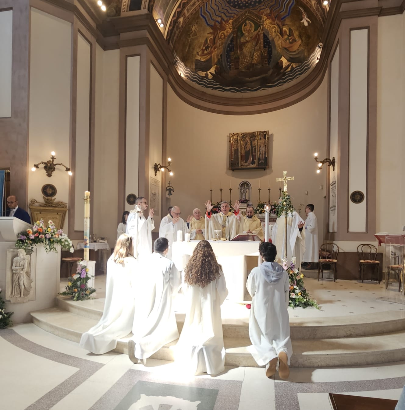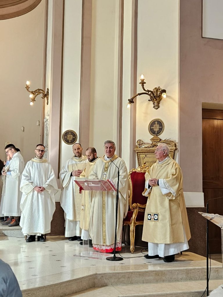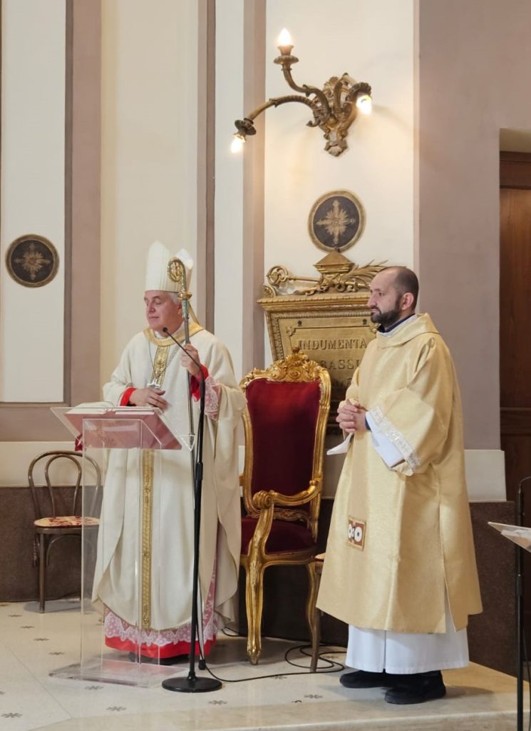 Quando noi siamo certi di incontrarlo, allora Lui è sempre un po’ più in là, proprio per far sì che capiamo di diffondere la fede: ci sorprende sempre. Quest’anno ci sono stati nelle due diocesi due battesimi: Kenny a San Benedetto, ad Ascoli Devid Banaouas. Hanno deciso di battezzarsi. Nella chiesa cattedrale di Santa Maria della Marina, a San Benedetto, N’Guessan Kenny Maria Berth Kassi è scoppiata in una gioia irrefrenabile, una danza del suo Paese, e la comunità delle persone presenti ha danzato con lei. Un’esplosione di gioia. Noi siamo rimasti sorpresi e contenti, abbiamo sorriso, abbiamo gioito. Lo Spirito Santo danza, come dice Papa Leone. Mentre noi guardiamo il mondo con scetticismo, lo Spirito Santo danza e fa cose che noi non ci aspettiamo: solidarietà, giustizia, fraternità. E se lo Spirito Santo è nel mondo, noi siamo chiamati a danzare con Lui. Certo, nel mondo ci sono tante cose che ci provocano dolore, ma dobbiamo affidarci alla danza dello Spirito. Questo ci insegna Gesù e anche Basso. Il vostro patrono ha offerto la sua vita per testimoniare l’amore per Cristo e ha danzato e sperato. Chiediamo al Signore: custodiscici nel sacramento che ci hai donato, nel Battesimo, e continua a guidarci».