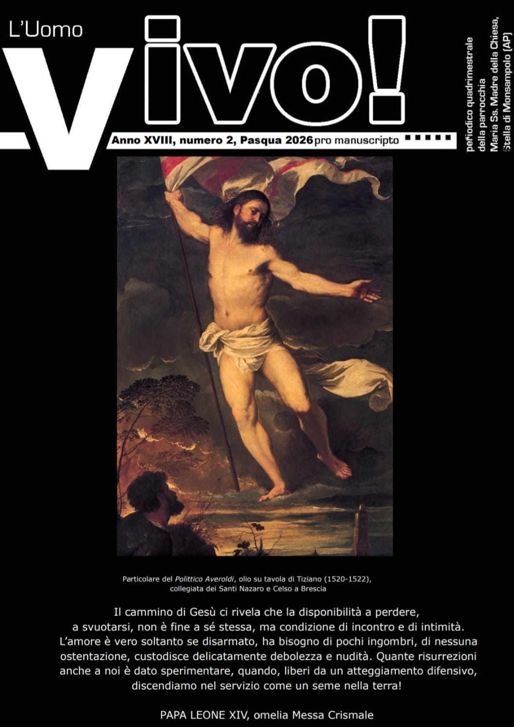In questo numero, dal titolo “L’Uomo vivo!“, la copertina è tutta dedicata al tema pasquale: dalle parole pronunciate da papa Leone XIV durante la Messa Crismale all’immagine del Risorto trionfante tratto dal Polittico Averoldi dipinto da Tiziano, in cui l’iconografia tradizionale della Resurrezione si combina con quella dell’Ascensione, mostrando un Cristo sfolgorante che, manifestando la sua debolezza e nudità, si rivela in tutta la Sua gloria.
