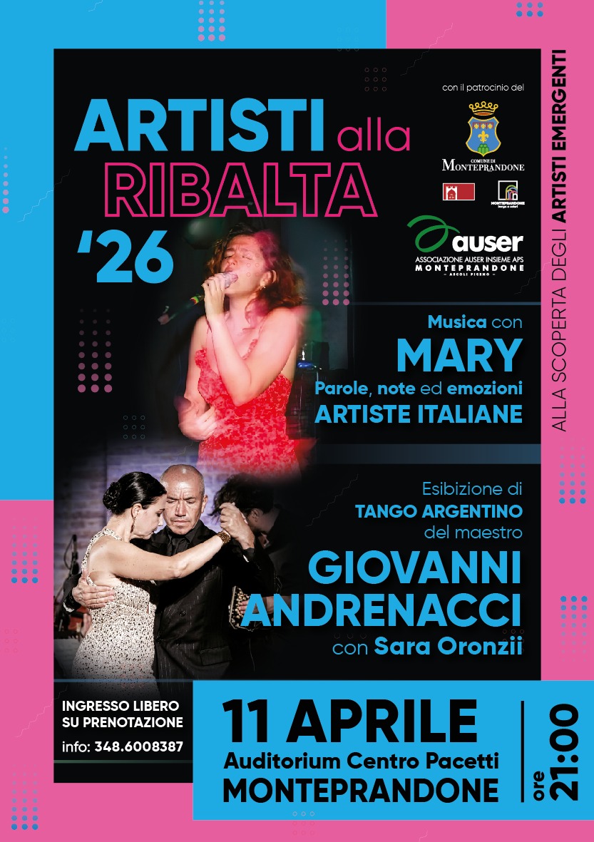 MONTEPRANDONE – Anche per il 2026, si rinnova l’appuntamento con “Artisti alla Ribalta”, la rassegna organizzata dall’Auser Insieme Monteprandone, con il patrocinio del Comune di Monteprandone, che dà voce e corpo a personaggi del mondo della musica, della letteratura, dell’arte, dello sport, del mondo del sociale, non ancora noti al grande pubblico, ma di grande spessore.