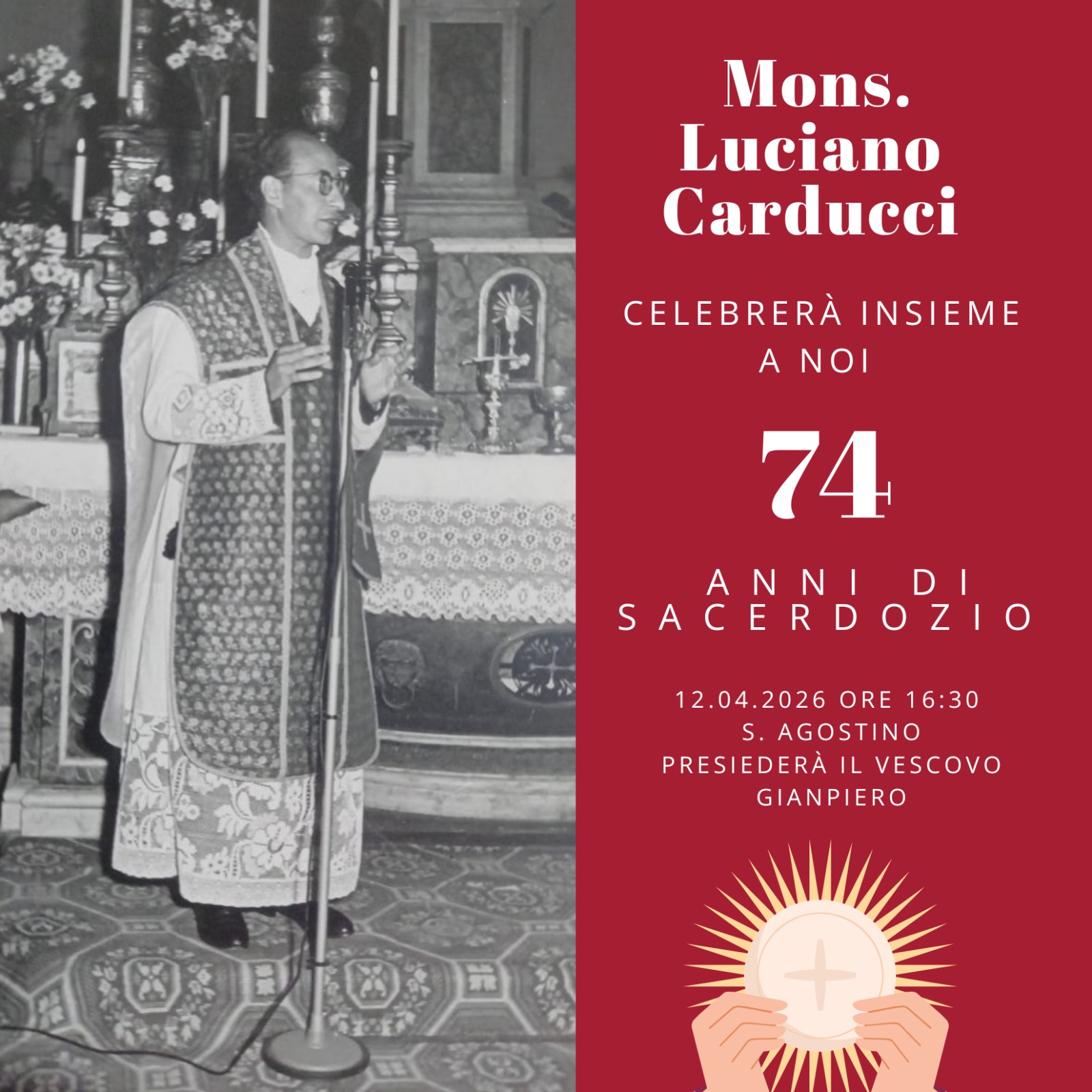 Per Don Luciano si tratta di una ricorrenza particolarmente intensa: non solo i 74 anni dal giorno della sua ordinazione sacerdotale, avvenuta il 12 aprile 1952 durante la veglia pasquale ad Ascoli Piceno, ma anche i 40 anni dalla sua nomina a Rettore del Santuario Diocesano del Miracolo Eucaristico (1986), servizio che ha esercitato con dedizione fino alla consegna del titolo a don Armeno Antonini, defunto parroco, alla riapertura della chiesa di Sant’Agostino.