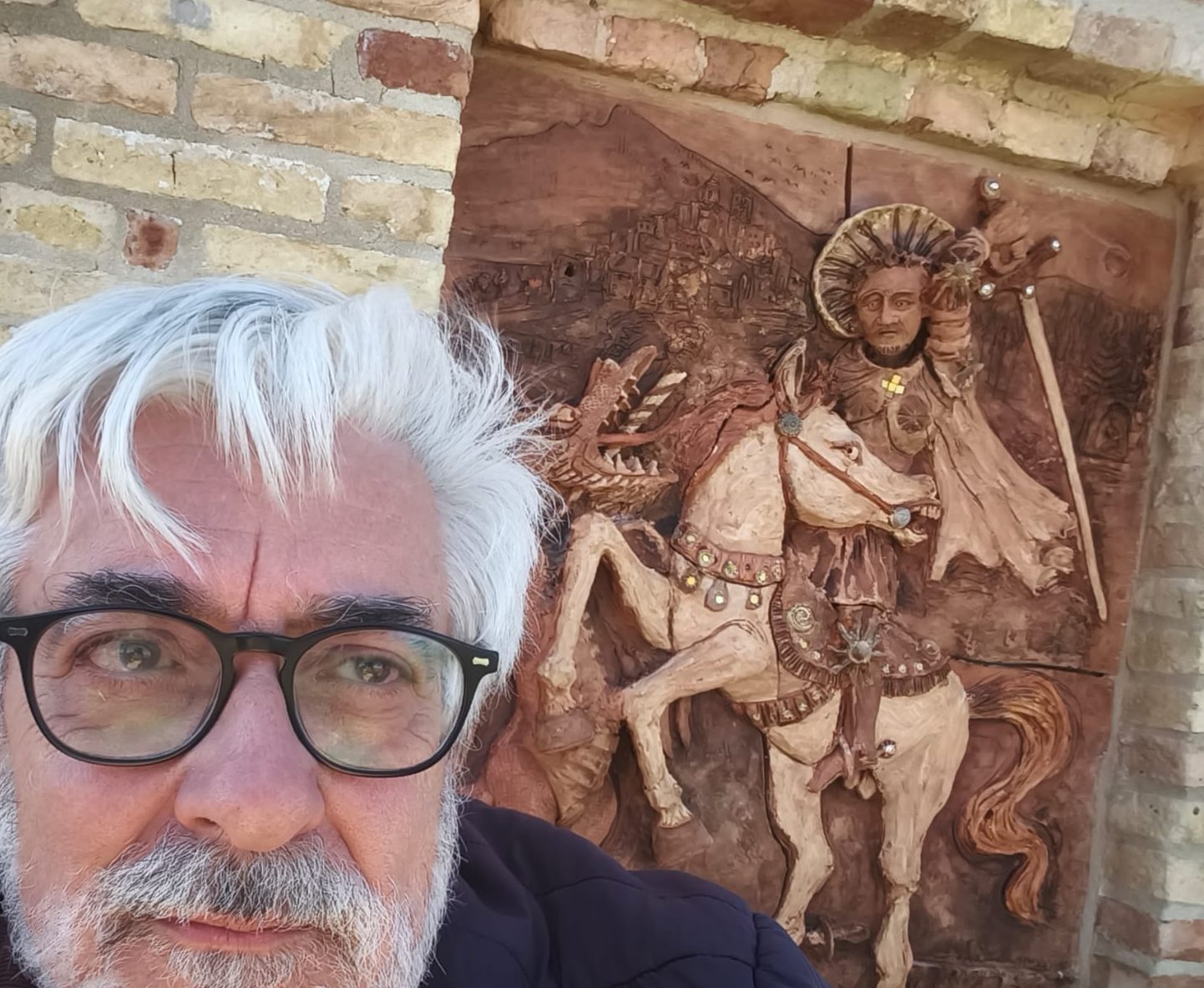 “L’altorilievo è in terracotta, eseguito tra dicembre 2025 e gennaio 2026, dimensioni m 1,30 per 1,10 e raffigura il combattimento di San Giorgio col drago, ispirandosi liberamente a un famoso dipinto di Carlo Crivelli del 1470, facente parte del Polittico di Porto San Giorgio, attualmente conservato a Boston.