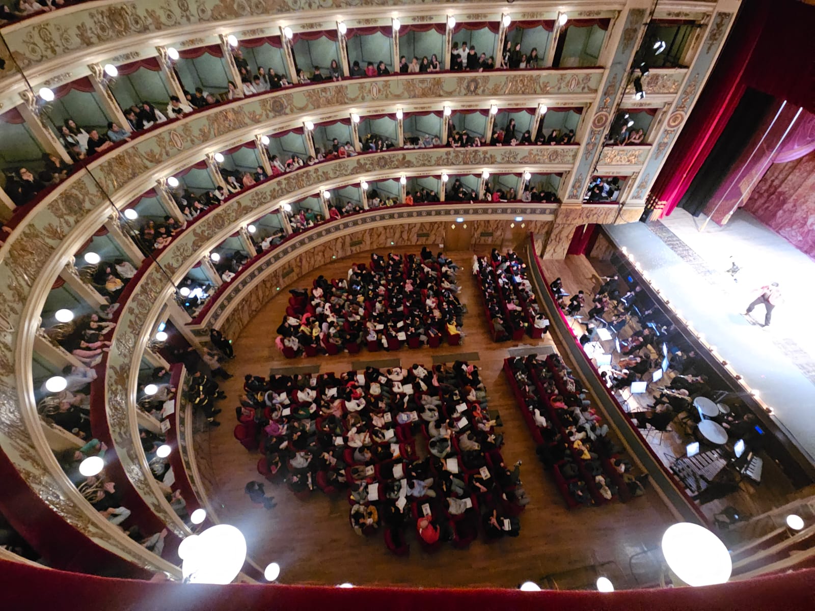 La bella e limpida giornata ha favorito l’iniziativa, che si è svolta in orario scolastico, con partenza e raduno alle 8,00 del mattino e ritorno entro le 13, per il proseguimento delle attività scolastiche fino alle 14 per la secondaria di primo grado. I bambini e i ragazzi si sono dimostrati molto attenti e partecipativi, veramente entusiasti… Soprattutto i piccoli della primaria, guidati dalla vicaria insegnante Franca Basso e da altre colleghe, hanno partecipato intonando i canti, i cui testi, come in un karaoke, venivano visualizzati su uno schermo dentro il teatro ed erano esortati dal maestro direttore d’orchestra. Per la scuola secondaria erano presenti gli insegnanti Federica Chiappini e Paolo Incicco, con la vicaria Luigina Ceddia e altri docenti.
