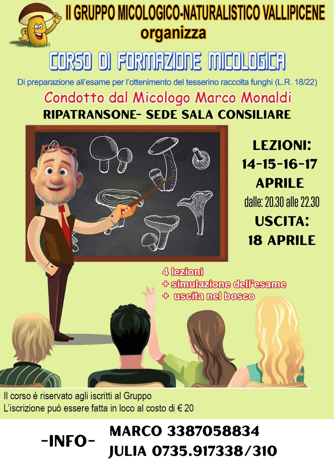Il percorso è organizzato dal Gruppo Micologico-Naturalistico Vallipicene, in particolare è tenuto dal micologo Marco Monaldi, e si articola in quattro lezioni teoriche, una simulazione d’esame e un’attività pratica sul campo.
