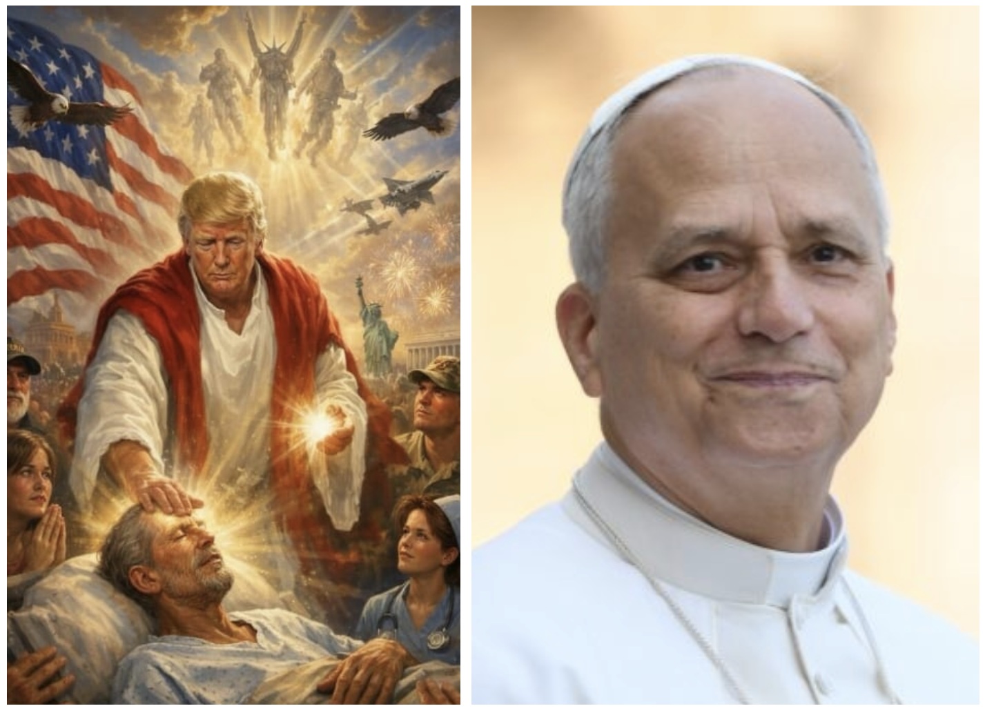 L’immagine diffusa da Donald Trump, in cui è raffigurato come Gesù Cristo mentre compie un gesto di guarigione, circondato da simboli patriottici e apparati militari, fa emergere una visione in cui militarismo e neoimperialismo vengono sacralizzati, fino a configurare una sorta di nuova deriva “millenaristica” e “messianica” della politica trumpiana, come strumento salvifico, sottraendosi così a ogni autentico giudizio critico. Non dimentichiamo inoltre la preghiera dei pastori su di lui nella stanza ovale, dove si invocava addirittura la vittoria sull’Iran. Anche l’arcivescovo di Chicago, il cardinale Cupich, in una dichiarazione, ha fortemente criticato questa deriva comunicativa ed etica di Trump e dei suoi collaboratori. A tutto questo si aggiunge l’episodio recentemente riportato dalla stampa internazionale, relativo alle dichiarazioni critiche nei confronti di Papa Leone. Come sappiamo, Papa Leone ha espresso più volte un giudizio particolarmente severo in merito alle tensioni geopolitiche contemporanee, accusando la politica americana di Trump come moralmente inaccettabile, sostenuta da una illusione di onnipotenza, ribadendo che la guerra non è mai una soluzione accettabile ai conflitti internazionali.
