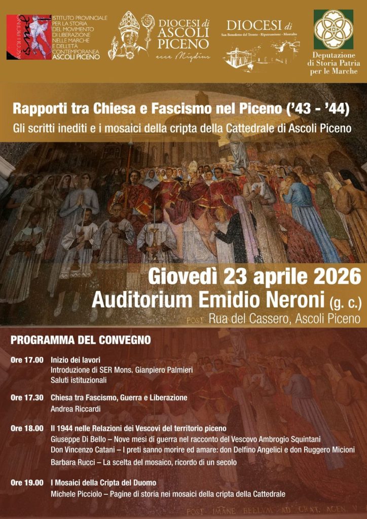 All’appuntamento prenderanno parte diversi studiosi e storici che si confronteranno sul tema “Rapporti tra Chiesa e Fascismo nel Piceno (’43-’44)”, con particolare attenzione a documenti inediti e ai mosaici della cripta della Cattedrale cittadina.