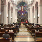 In primo piano, sulla destra, troviamo figure della Diocesi di Ripatransone, eretta da San Pio V nel 1571. Il Venerabile sambenedettese, anzi “sudentrino”, padre Giovanni dello Spirito Santo, al secolo Giacomo Bruni, figlio spirituale di don Francesco Sciocchetti, divennne sacerdote passionista e morì prematuramente a seguito di una malattia. La Serva di Dio Lavinia Sernardi in Giammarini (1588-1623) con i figli Francesco (futuro sacerdote oratoriano) e Margherita (futura suora cappuccina). Il Servo di Dio Simone, al secolo Filippo, Filippovich (1732-1802) con le sembianze del committente Mons. Giuseppe Chiaretti che regge in mano il modellino della basilica: di origine bosniaca, divenne frate e parroco di una chiesa nelle sue terre, ma per fuggire dai continui attestati di stima di cui era oggetto, per umiltà chiese di entrare nel Ritiro della Maddalena (attuale Convento delle Passioniste) di Ripatransone. Era un uomo mite oltre ogni limite. Per farlo esercitare nell’umiltà, un superiore gli impose di professarsi uno zuccone davanti ai suoi confratelli, ma egli preferì dire che era una semplice zucca. Per comprendere ancora meglio l’episodio, si tenga conto che Ferdinando Zucconi era un insigne biblista gesuita nei confronti del quale il nostro sentiva di non poter reggere il paragone.