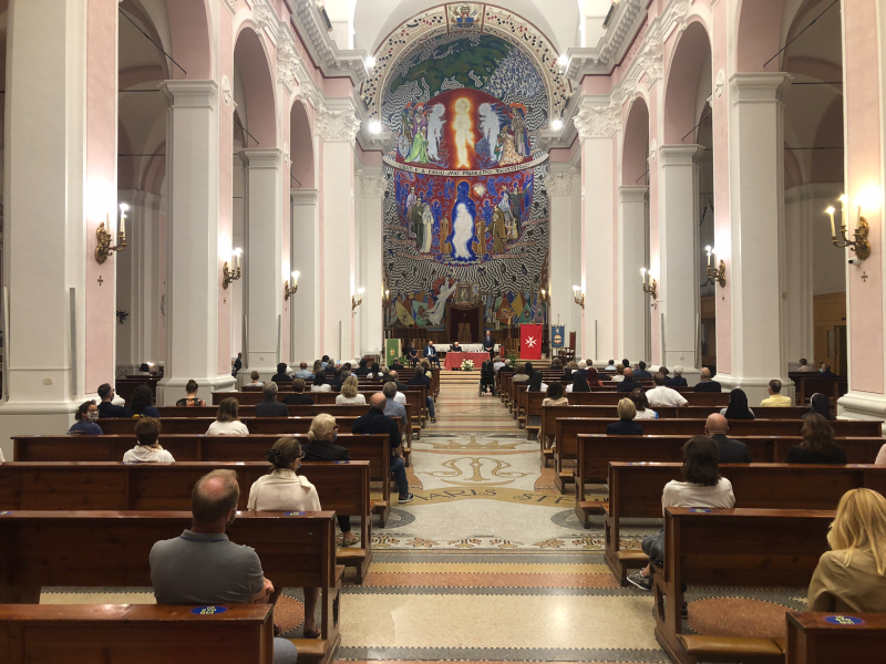 Il dipinto che orna l’abside della Basilica Cattedrale di Santa Maria della Marina è stato realizzato dal frate cappuccino Ugolino da Belluno (al secolo Silvio Alessandri, Belluno 15 dicembre 1919 – Roma 24 maggio 2002) con l’aiuto di suo nipote Silvio fra il giugno e il dicembre del 1993, quando il religioso aveva 72 anni. Egli viveva nel convento dei Frati Cappuccini di Via Veneto a Roma ed era amico personale di grandi artisti contemporanei come Carlo Carrà, Giacomo Manzù, Giorgio De Chirico e Gino Severini (da cui apprese la tecnica del mosaico). Nel mondo un centinaio di opere porta la sua firma.