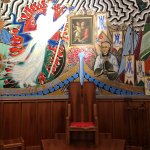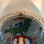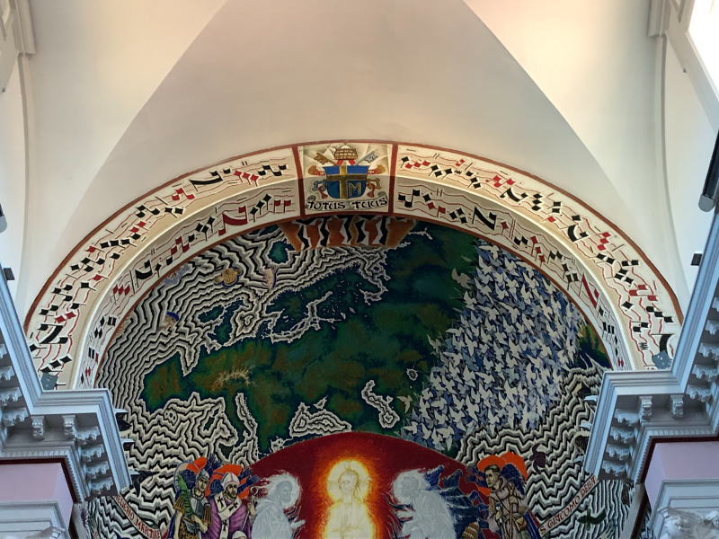 Sull’arco trionfale si trova lo stemma di Giovanni Paolo II, oggi Santo, quasi come una chiave di volta, composto dalla tiara – ovvero la corona papale fatta da tre corone, indossata dai pontefici fino a Paolo VI e presente negli stemmi papali fino a Giovanni Paolo II – le chiavi del paradiso e lo scudo con la croce di Cristo e la “M” di Maria, al quale il Papa polacco era tanto devoto. Tutto intorno osserviamo lo spartito di un canto gregoriano impostato su 4 righe con note quadrate.