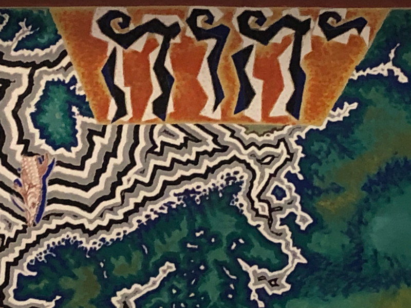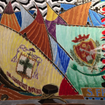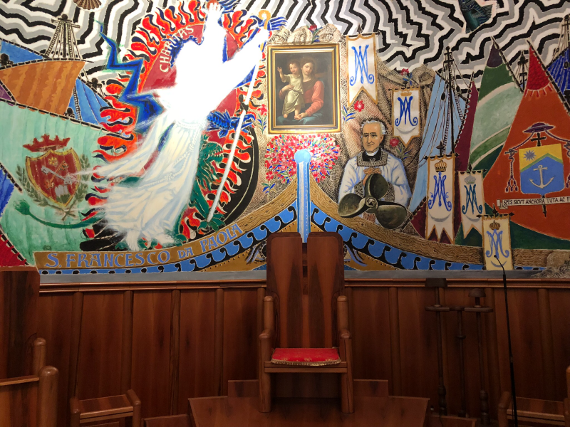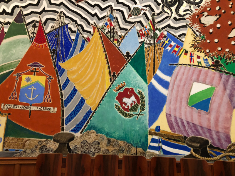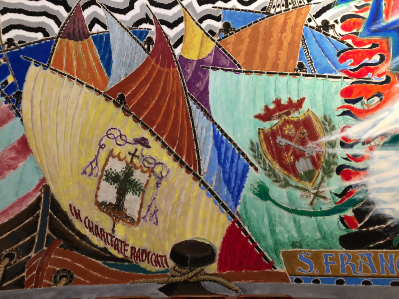 Infine, in basso è rappresentata la processione della Festa della Madonna della Marina con paranze (da “paro”, ovvero “paio”, in quanto occorrono due di queste imbarcazioni per fare la pesca a strascico) dalle caratteristiche vele triangolari e con lancette con le vele quadrangolari. Nella parte centrale fa bella mostra di sé lo scafo dell’imbarcazione che porta la venerata immagine della Madonna della Marina col mazzo di fiori che sarà gettato fra i flutti in ricordo di quanti per lavoro o per svolgere il loro civico dovere sono morti in mare. Sull’imbarcazione è presente il ripano Mons. Francesco Sciocchetti (1863-1946), IV Parroco della Marina e fondatore della Chiesa Nuova – che regge in mano un’elica, a ricordo del primo motopeschereccio da lui stesso varato nel 1912. Insieme a lui San Francesco da Paola (1416-1507) – nei cui tratti somatici intravvediamo l’autoritratto di Ugolino da Belluno) – protettore dei marinai in quanto secondo la leggenda passò lo stretto di Messina navigando sul suo mantello, protende le mani verso la Vergine Maria.