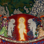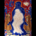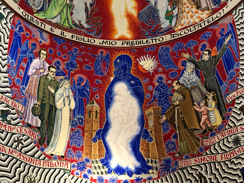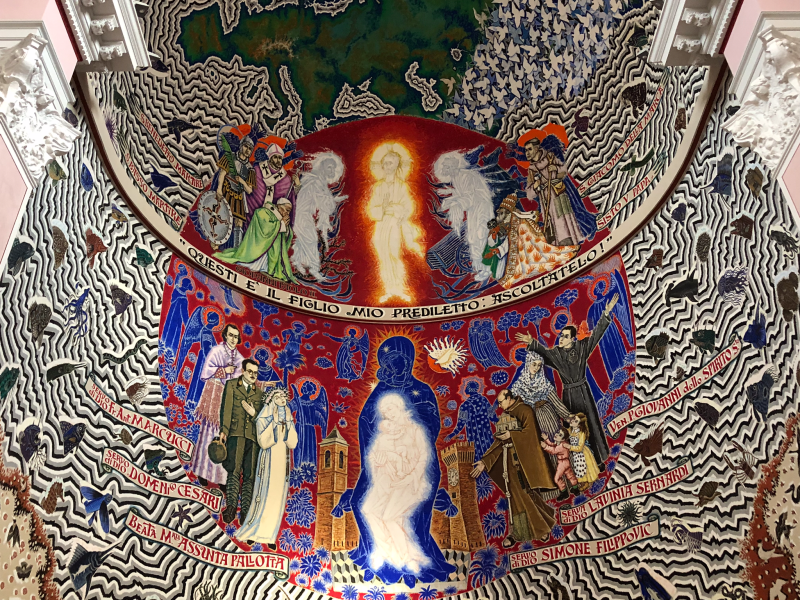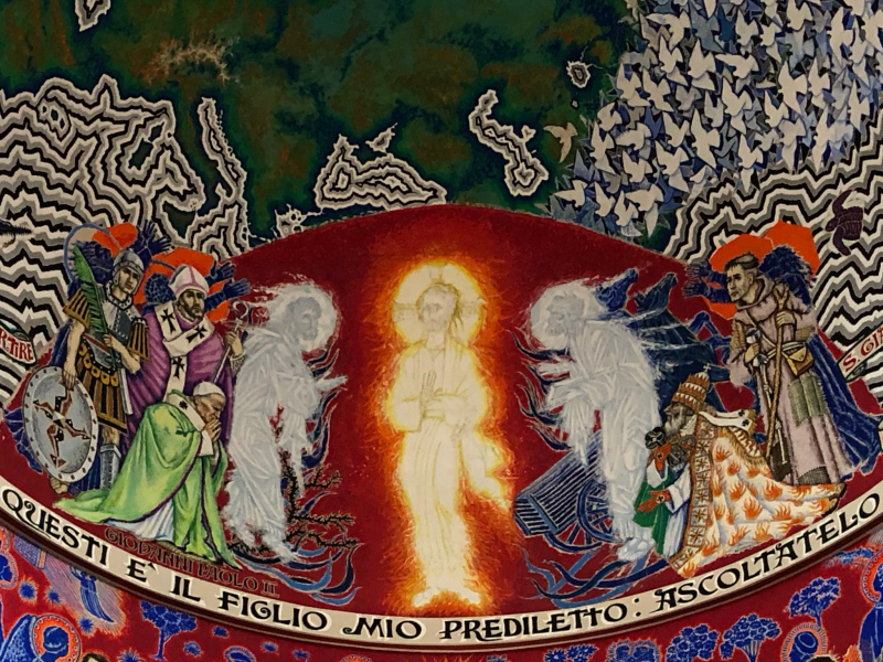 Protagonista dell’affresco è la Trinità: il Padre rappresentato dal Tetragramma – quattro lettere ebraiche che si leggono da destra verso sinistra di colore scuro su uno sfondo trapezoidale di colore arancione – il Figlio nell’atto di trasfigurarsi e lo Spirito Santo in prossimità della Vergine Maria. Nella calotta l’artista ha rappresentato uno stormo di colombe che si dirige verso l’Europa, volendo auspicare la pace nell’Ex Jugoslavia che al tempo della realizzazione del dipinto era martoriata dalla guerra.