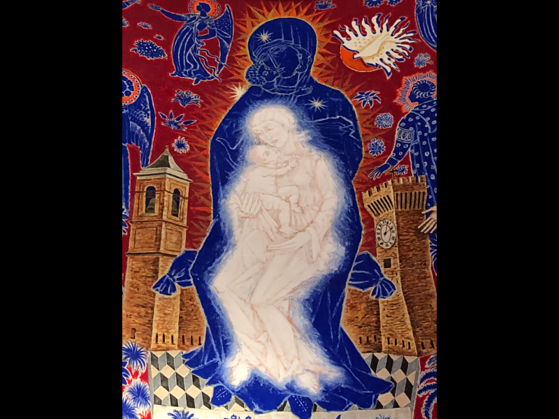 Nella parte inferiore spicca in posizione preminente la figura della Vergine Maria col Bambino, rappresentata prima come una donna del popolo e poi con le sembianze della Madonna di Vladimir, un’icona russa risalente al XV secolo nella quale Gesù bambino abbraccia la madre. La Madonna siede su un trono che ha come braccioli il campanile della chiesa di San Benedetto Martire e la Torre dei Gualtieri e poggia i suoi piedi su un pavimento che ricorda per forma quello disegnato da Borromini per la chiesa di San Giovanni in Laterano, Cattedrale di Roma: Ugolino da Belluno ha voluto così creare un legame fra la cattedrale della Diocesi Truentina e quella della Diocesi di Roma. Sullo sfondo si riconoscono delle figure che sono una citazione del paradiso nel celebre Giudizio Universale dipinto dal Beato Angelico nel 1431 e oggi custodito nel Convento di San Marco a Firenze.