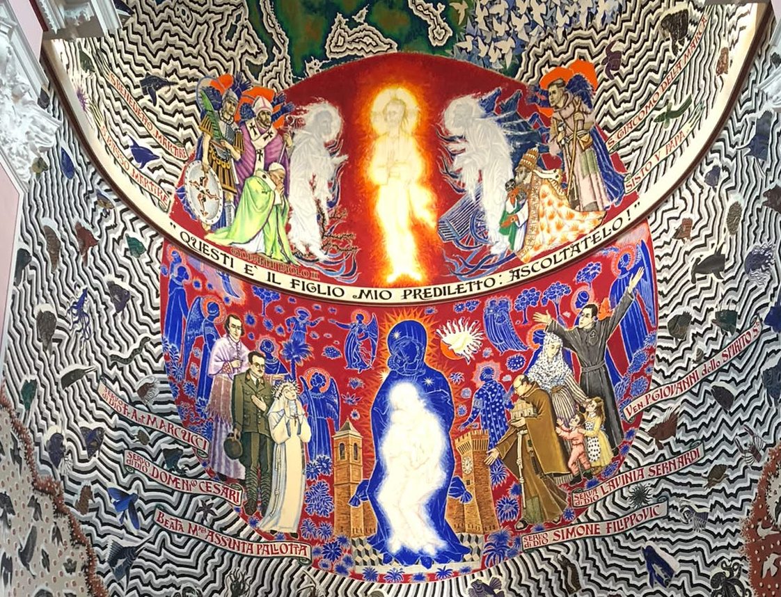 Protagonista dell’affresco è la Trinità: il Padre rappresentato dal Tetragramma – quattro lettere ebraiche che si leggono da destra verso sinistra di colore scuro su uno sfondo trapezoidale di colore arancione – il Figlio nell’atto di trasfigurarsi e lo Spirito Santo in prossimità della Vergine Maria. Nella calotta l’artista ha rappresentato uno stormo di colombe che si dirige verso l’Europa, volendo auspicare la pace nell’Ex Jugoslavia che al tempo della realizzazione del dipinto era martoriata dalla guerra.