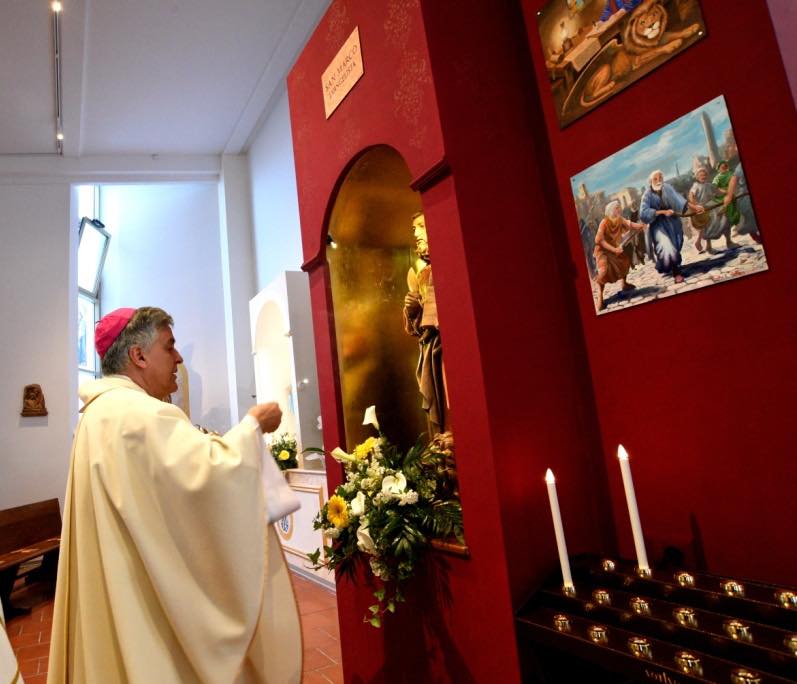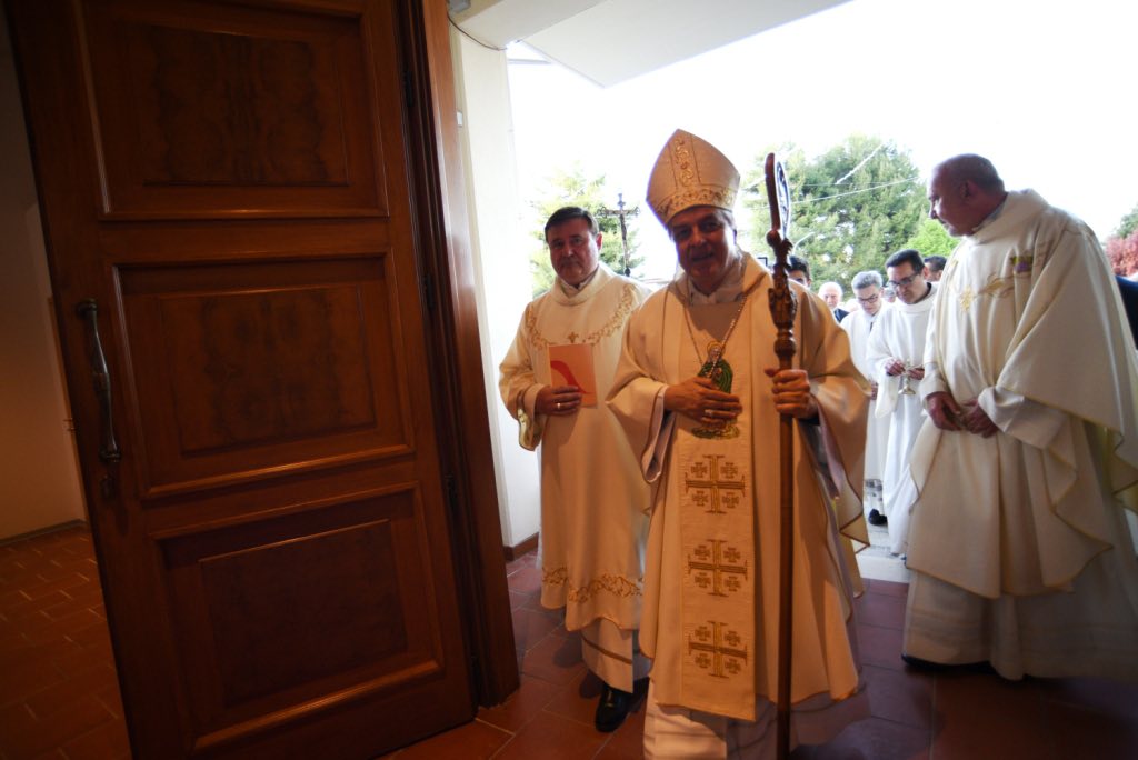 Questo è il senso di costruire una chiesa. È il Signore che ci chiama a formare la comunità, ad ascoltare la Parola, a consumare il Pane eucaristico. Oggi intercede per noi San Marco, il cui Vangelo è ricco di particolari e di molti interessanti dettagli. Tutto questo lavoro per rendere così nuova e bella, funzionale e a norma questa chiesa, ci spinga ad incontrare ancora di più il Signore, a sentirci sempre di più comunità. Bisogna anche doverosamente ringraziare l’8×1000, che ci ha consentito di effettuare questi importanti lavori, come ogni anno riusciamo a fare. Adesso faremo la benedizione dell’Altare, perché dopo tanto tempo che non vi si celebra più, c’è un rito che promuove e benedice il ripristino. Grazie per essere qui, così numerosi”. Il Vescovo ha salutato e ringraziato il parroco, i presbiteri presenti e il diacono don Alberto Fossati, con gli auguri per il recente compleanno.