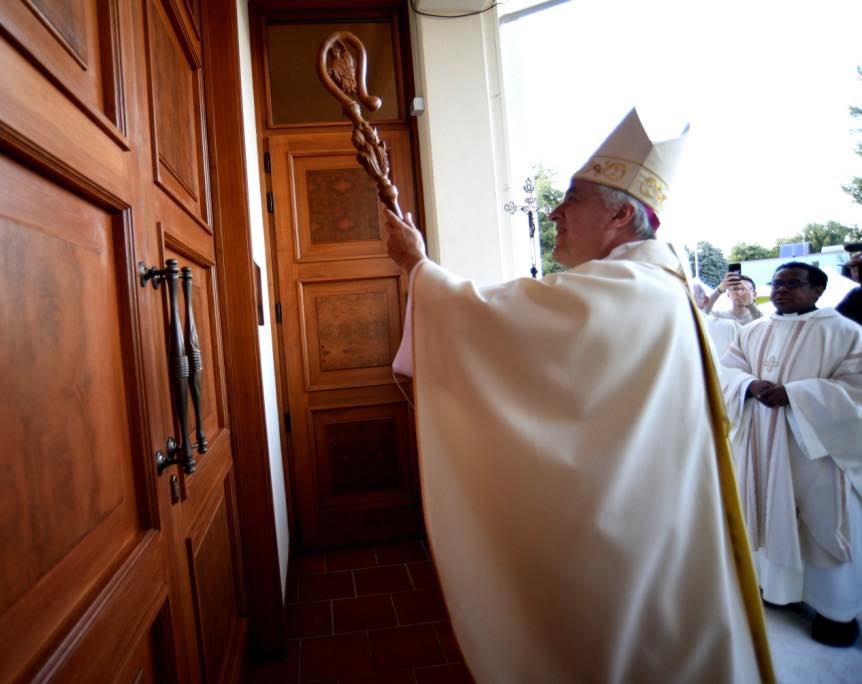Durante la Benedizione dell’Altare, i fedeli hanno rinnovato insieme al Vescovo e ai presbiteri il proprio Credo. Il parroco, mons. Adam Krzyzstof Baranski, chiamato “don Adam”, di origini polacche, ha ringraziato commosso il Vescovo per il supporto spirituale e materiale e per la sua costante presenza; poi ha ringraziato l’impresa che ha portato avanti i lavori con dedizione e le tante persone che hanno volontariamente collaborato per aiutare a ripristinare la bella Chiesa di San Marco Evangelista. Interessante, prima della celebrazione, notare che il Vescovo ha bussato tre volte al portone principale della Chiesa, che si è aperto, e nessun fedele era potuto entrare prima. A varcare la soglia per primo è stato proprio il Vescovo Gianpiero, tra un applauso e la grande commozione dei presenti.