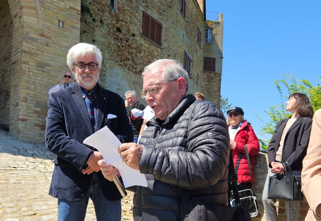 Abbiamo avuto negli anni difficoltà per reperire i fondi, ma poi grazie al Progetto di riqualificazione Tessuinum ed al PNRR abbiamo avuto l’opportunità di restituire tanti edifici storici danneggiati dal terremoto del 2016, in quanto siamo collocati nel cosiddetto cratere sismico – e in questo caso di migliorare un’opera architettonica storica già esistente. Ringrazio il Commissario straordinario del Governo per la riparazione e la ricostruzione sisma, Guido Castelli, che ci ha permesso di finanziare, approvando i nostri progetti di riqualificazione, tante opere, tra cui anche questa collocazione artistica. Ringrazio inoltre la Regione, oggi presente tra noi: Enrico Piergallini, Consigliere regionale e Vice Presidente del Consiglio Regionale delle Marche; il Consigliere provinciale Serena Silvestri; il Sindaco di Ripatransone Alessandro Lucciarini De Vincenzi; l’ex sindaco di Cossignano Giancarlo Vesperini; le Forze dell’Ordine e le altre Autorità intervenute.