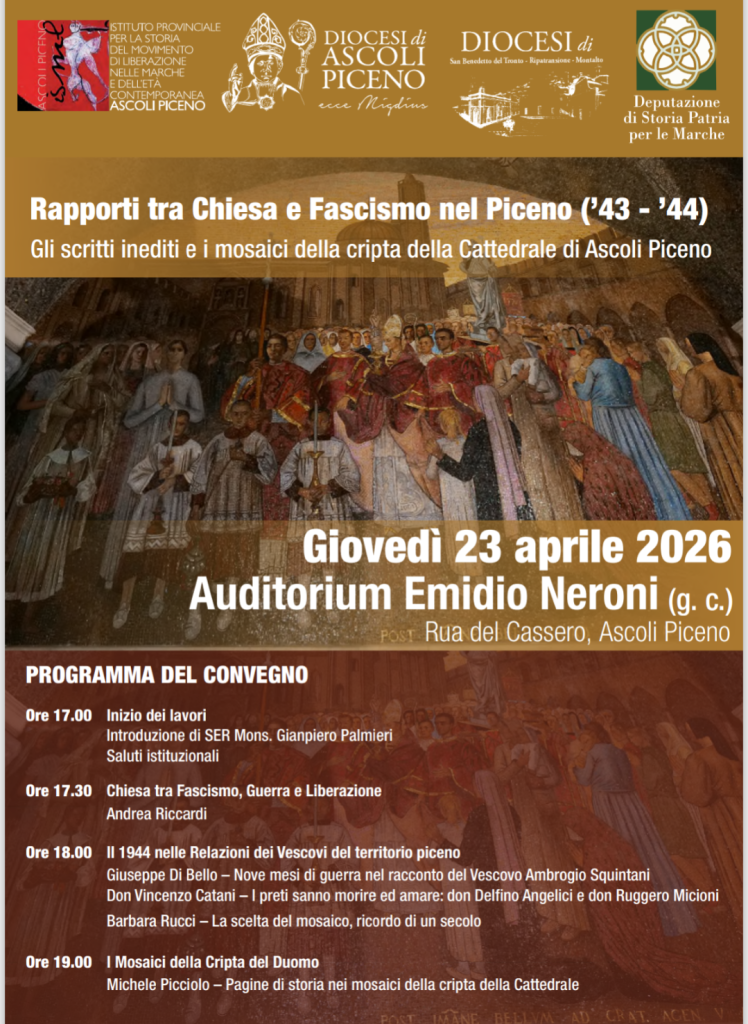 ASCOLI PICENO – Si è tenuta ieri, lunedì 20 aprile, presso l’episcopio di Ascoli Piceno, la conferenza stampa di presentazione del convegno dal titolo Rapporti tra Chiesa e Fascismo nel Piceno (’43-’44) – Gli scritti inediti e i mosaici nella cripta della Cattedrale di Ascoli Piceno.