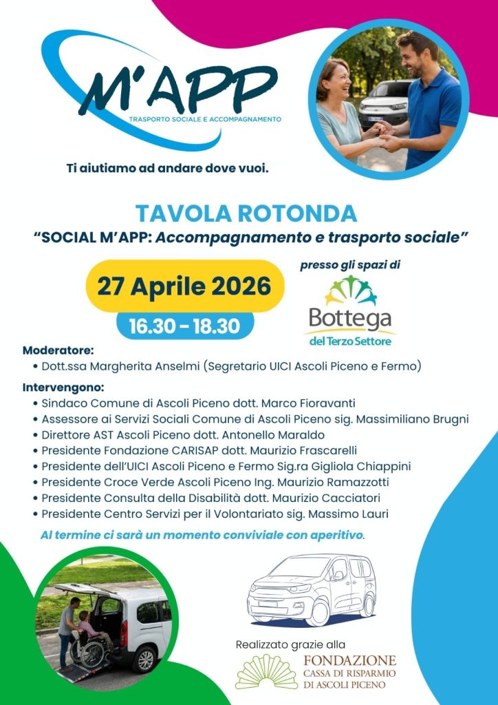 ASCOLI PICENO – A un anno mezzo di distanza dal primo viaggio inaugurale, cresce, in numeri e protagonisti, il progetto “M’App” per l’accompagnamento e il trasporto sociale.  Nato con l’obiettivo di migliorare la qualità della vita delle persone con disabilità o non autosufficienti, garantendo loro gli spostamenti, il progetto, sostenuto dalla Fondazione Carisap, mira ad ampliare ulteriormente la propria rete.