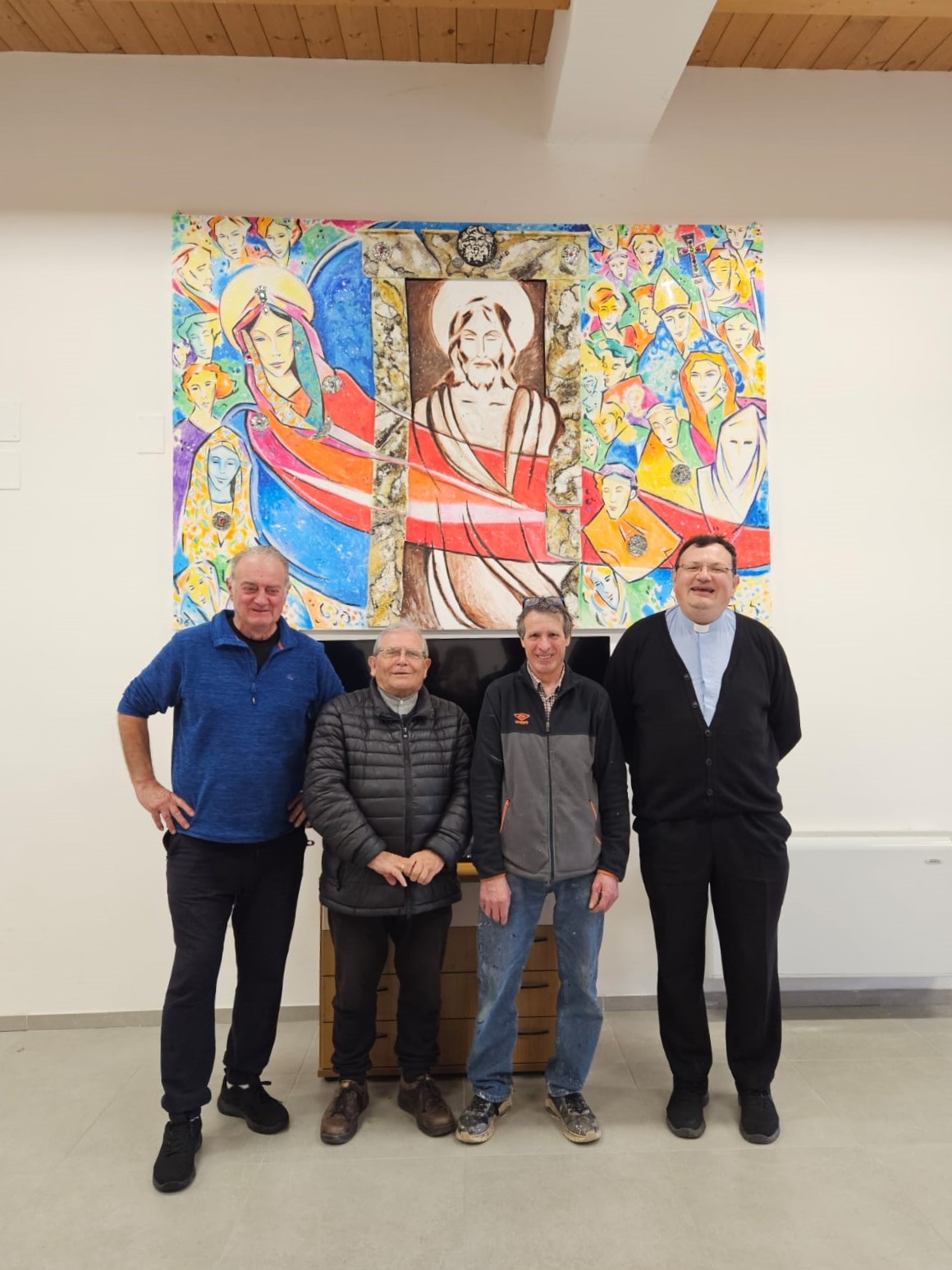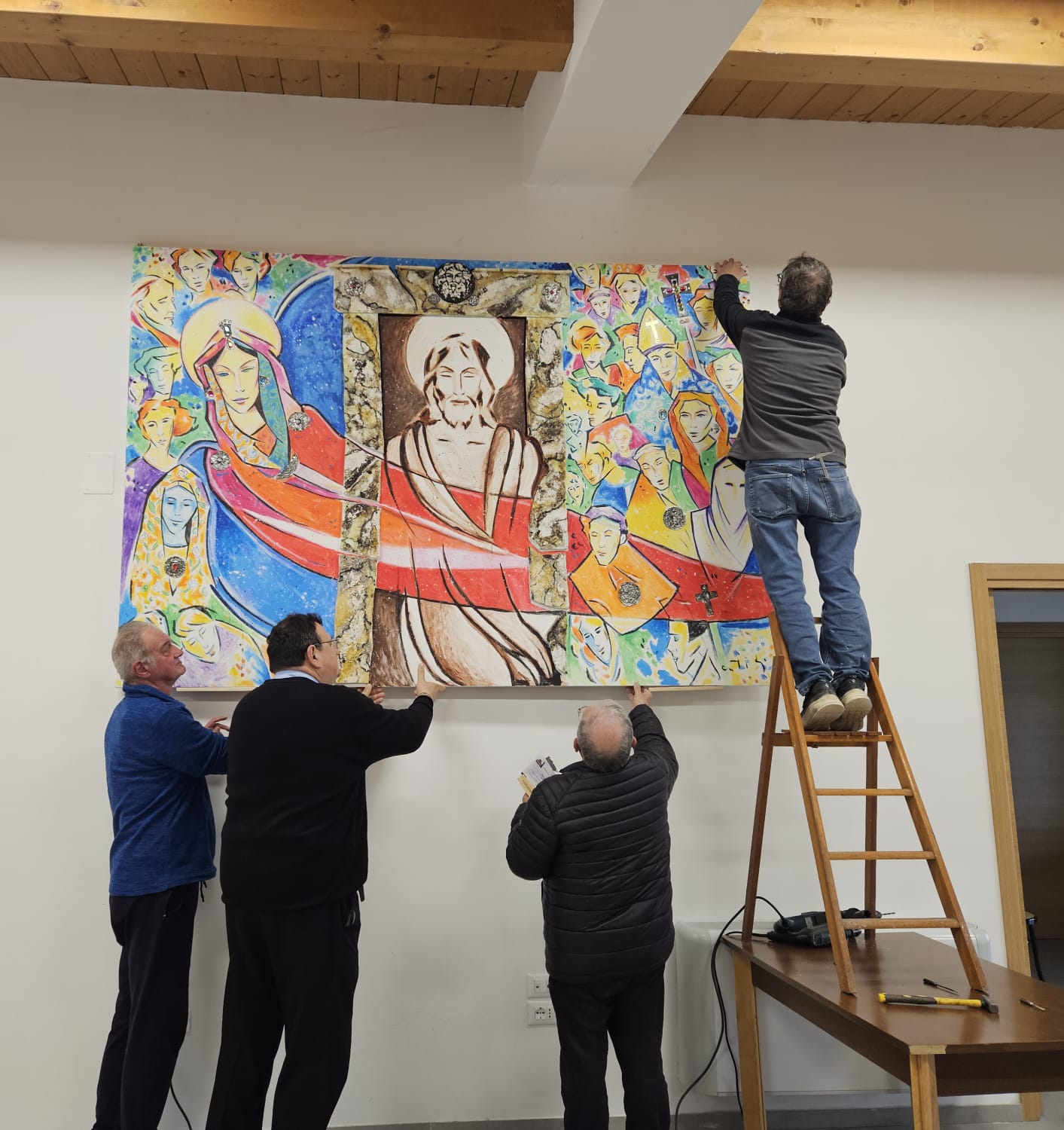 Per il parroco, mons. Federico: “Il dipinto della Pasqua, passaggio dalla morte alla resurrezione, esprime bene l’avvenimento fondante la nostra fede e il coinvolgimento di Maria, che ha ricevuto da Gesù in croce la consegna di Giovanni, rappresentata dal grande mantello celeste che abbraccia tutta l’umanità espressa dai 33 volti… Guardando il dipinto, sentiamoci tutti uniti e avvolti dall’abbraccio di Maria, inondata dal sangue del suo Figlio di colore rosso”.