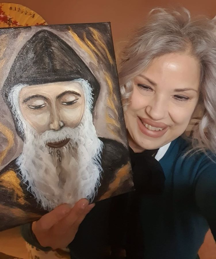 “La passione per la pittura è nata dopo aver scoperto il tumore al polmone. Avevo bisogno di ritrovare un po’ di pace interiore, di tranquillità, quindi mi recai da una mia amica pittrice. Non sapendo cantare né suonare, ma a dire il vero non sapevo nemmeno dipingere, cercavo qualcosa che non mi facesse pensare continuamente alla mia malattia, qualcosa di bello che rendesse le mie giornate migliori. Aver sostenuto due tumori in quattro mesi mi ha resa una persona stanca sia fisicamente che mentalmente: avevo bisogno di qualcosa che mi alleggerisse la mente. Questa mia amica, in quel periodo, stava preparando una mostra e mi invitò a dipingere un quadro di san Charbel. Io ero molto perplessa perché, fino ad allora, non avevo mai disegnato nemmeno un fiore, una casetta, cioè cose semplici, figurarsi dipingere un volto. Avevo comunque capito che avrei dovuto farlo, perché lei insisteva così tanto che sembrava una richiesta non più terrena, ma qualcosa che venisse dall’alto, qualcosa di più profondo. Non sono una pittrice, mi sento invece di essere una piccola matita nelle mani di Gesù: dipingo veramente da poco tempo e riconosco che è un dono del Signore e di san Charbel. Il mio intento è far conoscere la sua figura a più persone possibili affinché lui doni pace, sollievo e speranza a tutti coloro che ne hanno bisogno, così come li ha donati a me. Da lì ho iniziato a dipingere i volti di altri santi: ora lo sento come una chiamata. Se disegno il volto di un determinato santo è perché in quel momento c’è qualcosa che mi spinge a disegnare proprio lui o lei. Non saprei dipingere su richiesta, ma solo attraverso un’ispirazione particolare. Io, prima di iniziare, prego tanto e sento che l’ispirazione mi arriva proprio dal santo che sto dipingendo. Sto attenta alle forme, all’espressione del viso e soprattutto ai colori. Mentre dipingo sento che il Signore mi ispira e guida la mia mano; quando ammiro l’opera finita resto meravigliata. Durante la lavorazione è come se avessi la vista coperta da un velo e, a opera terminata, quel velo cade”.