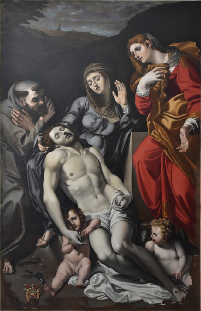 Il Cristo deposto si configura invece come una copia dell’analogo soggetto realizzato da Annibale Carracci, oggi conservato al Louvre. L’opera testimonia la diffusione, soprattutto in contesti periferici, di modelli derivati dai grandi maestri, spesso su commissione di importanti committenze locali. La scena, che raffigura Cristo deposto tra la Madonna e Maria Maddalena, è arricchita dalla presenza di due angeli: uno con il volto segnato dal dolore, l’altro intento a indicare la ferita del chiodo.
