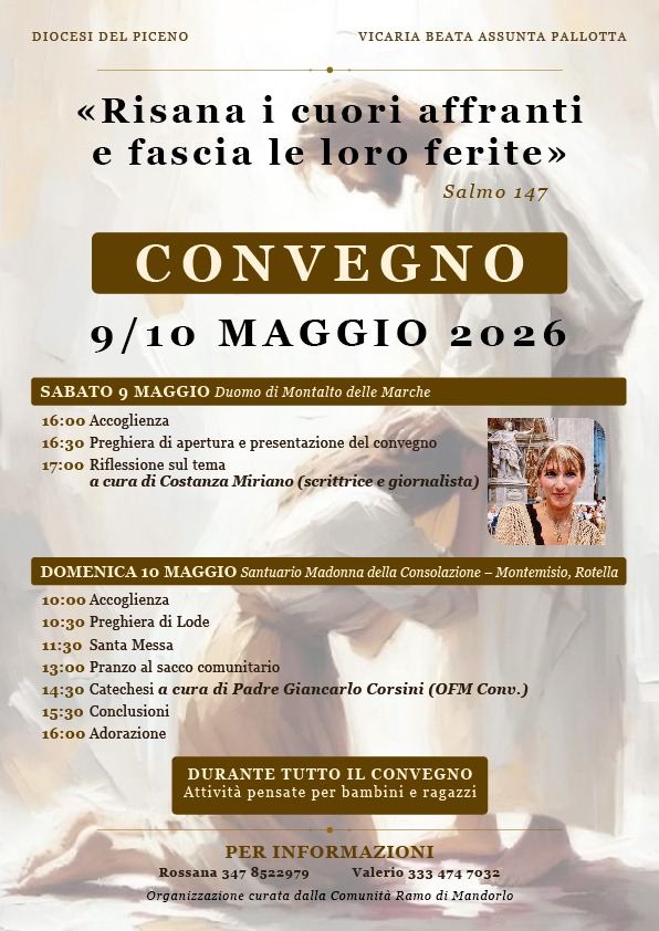 MONTALTO DELLE MARCHE – Si terrà il 9 e 10 maggio, tra il Duomo di Montalto delle Marche e il Santuario Madonna della Consolazione di Montemisio (Rotella), il convegno dal titolo «Risana i cuori affranti e fascia le loro ferite», ispirato al Salmo 147. L’iniziativa, promossa dalla Vicaria Beata Assunta Pallotta, si propone come un momento di riflessionesul tema della sofferenza interiore e della guarigione spirituale.
