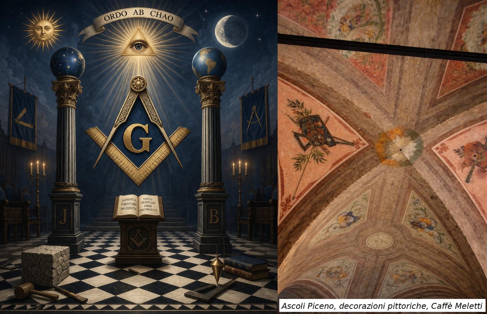 Un elemento suggestivo sul piano simbolico è individuabile negli archi esterni del Caffè Meletti, edificio costruito tra il 1881- 1884 come Palazzo delle Poste e Telegrafi nell’Ascoli post unitaria. Tra le decorazioni floreali si intravedono motivi che richiamano la squadra e il compasso, simboli per eccellenza della Massoneria che deriva dal simbolismo dei Liberi muratori (vedere immagine articolo). Tali elementi, pur inseriti in un contesto ornamentale, potrebbero essere interpretati come segni di una presenza massonica costante nella città negli ultimi due secoli.