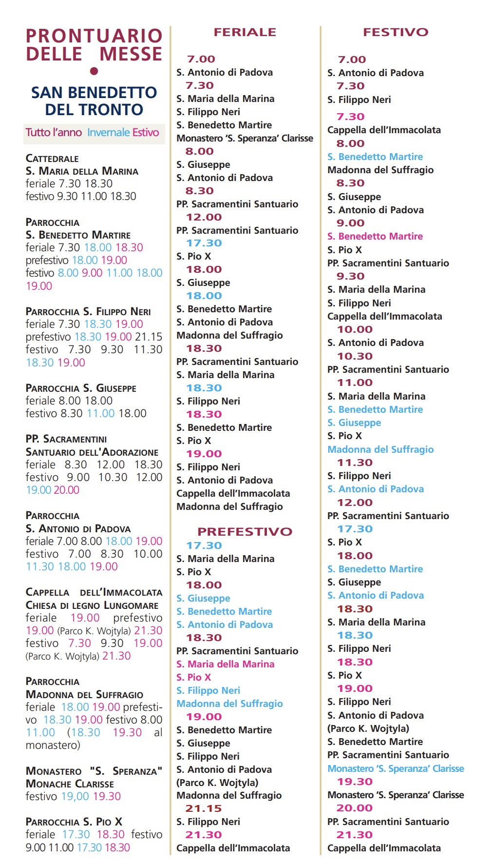 Scarica l’opuscolo completo con tutti i riferimenti per i “Luoghi dell’Incontro“, dove confessarsi e gli orari delle Messe nei comuni della diocesi di San Benedetto del Tronto – Ripatransone – Montalto: Opuscolo-turisti-2025